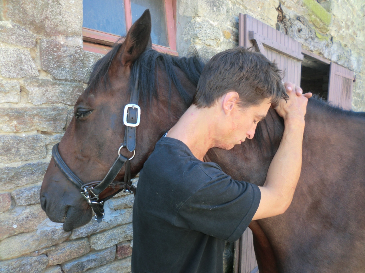 | Dire merci | Mais non mais non ! Et voilàààà :Jour 29 Nous ouvrons les yeux sur les rais de lumière emplis de poussière qui percent les fentes de la vieille porte de bois. Nous sautons dans nos jeans raides de crasse et attaquons la cuisson du café sur le réchaud, posé à même le sol. Je vais saluer Eden dans la foulée et lui servir son petit dèj, puis quand Merlin donne les premiers signes d’intelligence (signaux vocaux de base et aptitude à marcher presque droit), nous rassemblons nos affaires pour le départ. Je vais chercher Eden, le sors de son pré, et m’arrête net : il boîte. Merde. Je le fais marcher un peu le long de la route, mais le verdict est sans appel : il s’agit du même antérieur droit que trois semaines plus tôt, et la gêne semble bien trop franche pour reprendre la route. A l’examen, le pied est chaud, sans plus, et on peut sentir un léger pouls battre à sa veine, mais j’ai déjà remarqué au fil de la randonnée que ses pieds constamment stimulés et échauffés laissaient plus ou moins sentir un léger pouls permanent. Pas de marque ou de plaie apparente. Avec un peu de chance ce n’est pas un abcès. Vu comme le fer est déjà élimé, il est possible que la fourchette se soit à nouveau fatiguée. Hier pourtant il n’avait rien… Je me retrouve à expliquer la situation à notre famille d’accueil, qui se montre bien entendu absolument adorable, et nous laisse disposer de la grange et du foin tout le temps qui s’avèrera nécessaire à Eden. Ils me fournissent le numéro de leur vétérinaire, que je contacte immédiatement. Il arrive… deux heures plus tard. C’est toujours moins de temps pour moi à angoisser sur place ! Eden, que j’avais attaché à l’entrée de la grange, se réveille de sa sieste le temps de donner son pied de mauvaise grâce. Comme de juste, l’examen de la sole et des allures ne révèle rien de précis, mais le vétérinaire penche en faveur d’un échauffement du pied, à cause du fer tout râpé, rendu presque inefficace. Rien d’autre à faire que de soulager sa douleur, lui donner des bains de pied et le mettre au repos. Je paye le sacrifice monétaire, rançon du soulagement, et Eden gagne une piqûre qui le défonce comme un gros pétard. Il reprend sa sieste dès le départ du praticien, complètement stone, la lèvre pendante. Notre randonnée s’arrête donc officiellement au pied de cette vieille grange. Je détache du licol mon vieux hackamore pour la première fois depuis le départ. La chose devrait m’émouvoir, mais je pense à peine à mon geste. Je me suis déjà faite à l’idée de finir ce périple, et j’ai pris par ailleurs l’habitude d’habiter chaque instant avec une efficacité pratique, presque animale. Je ne prends plus ce recul philosophico-romantique sur mes actes quotidiens, signe d’ennui finalement. Le bonheur avant tout s’ignore lui-même. ![]() Pendant que Merlin fait un gros câlin à un Eden trèèèès complaisant, et tout mou sous les caresses, j’organise notre rapatriement pour le lendemain. Puis j’emprunte un vélo, et je pars en mission à l’autre bout du village dénicher une clinique vétérinaire pour y acheter les analgésiques que m’a prescrits le véto, et qu’il n’avait plus en réserve. La chaleur est terrible, et je me paume à moitié avant de dénicher une clinique – pas celle que je cherchais, mais une autre, beaucoup, beaucoup plus loin. Le plan de la fille de nos hôtes était un peu tout pourri. J’arrive en sueur dans le hall : cette affreuse grande côte que j’ai dû grimper pour venir m’a tué. Jsuis une cavalière moi ! Les côtes, c’est à cheval d’habitude ! Retour au bercail avec la précieuse médecine. Eden reçoit avec un enthousiasme modéré une pleine seringue de Dafalgan pour Poney dans le museau, puis nous le laissons en paix à l’herbe. Bon. Nous voilà à la fin de nos vacances, avec du temps à tuer (quelle étrange expression). Nous commençons par aller voir la chienne husky qui s’ennuie dans le jardin d’une maison voisine. Elle est jeune, un peu folle, et complètement super-choupi. Elle semble prête à tout pour quelques caresses, et un peu d’attention. Nos hôtes nous ont confié que ses maîtres, un jeune couple, ne s’en occupaient pas tellement, et depuis la naissance de leur premier enfant l’abandonnaient la plupart du temps au jardin, sans aucune compagnie. Merlin et moi fomentons de très sérieux projets de hold-up, tandis que la chienne, transportée, nous inonde d’amour au travers du grillage bas. Elle se tortille littéralement, nous jette ses grosses pattes au visage, puis finit carrément par sauter par-dessus la clôture directement dans les bras de Merlin, où elle s’immobilise d’un coup. Merlin est tout saisi et ferme les yeux, avec sur le visage l’expression qui traduit chez lui une overdose du sentiment de mignon (bouche tirée presque douloureusement et les yeux fermés très fort). C’est avec regret que nous la reposons derrière le grillage. Malheureusement, on ne vole pas un chien comme on vole un poulet. Nos hôtes le matin même nous ont autorisés à leur emprunter leurs vélos, qui sont dans un autre état que le nôtre. Un épisode que j’ai oublié de relaté l’a pour toujours amputé de ses freins avant. Nous abordions une route en descente suivie d’une côte assez conséquente, et comme à notre habitude, moi et Eden étions passés les premiers, pour des raisons de sécurité. Pour l’anecdote, afin d’éviter qu’Eden ne suive Merlin au galop dans les descentes, nous les prenons les premiers, tranquillement au trot, puis une fois la côte entamée, Merlin suivait, et pouvait ainsi profiter de son élan. Un accident avec Eden deux ans auparavant m’a vacciné contre les galops pleine balle en descente. Donc nous venions de passer la descente et attaquions la côte en mode charge cheyenne, et pendant ce temps Merlin nous suiv