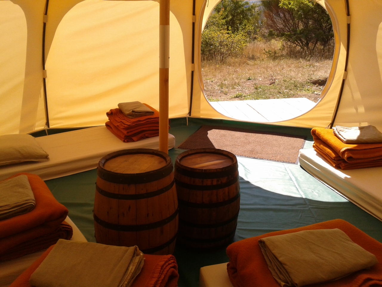 | Dire merci | voici deux photos de l'aménagement de la tente qui est modulable en fonction des réservations ( couple, famille... ) Bon c'est du provisoire, j'aimerai y mettre un joli sol ( le vert, c'est pas top ) et faire une jolie déco reposante, zen, lotus ( j'ai déjà de jolies lampes lotus, je suis en avance... )![]() ![]() |
