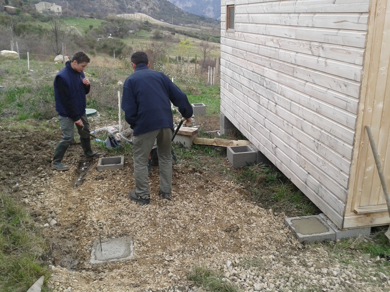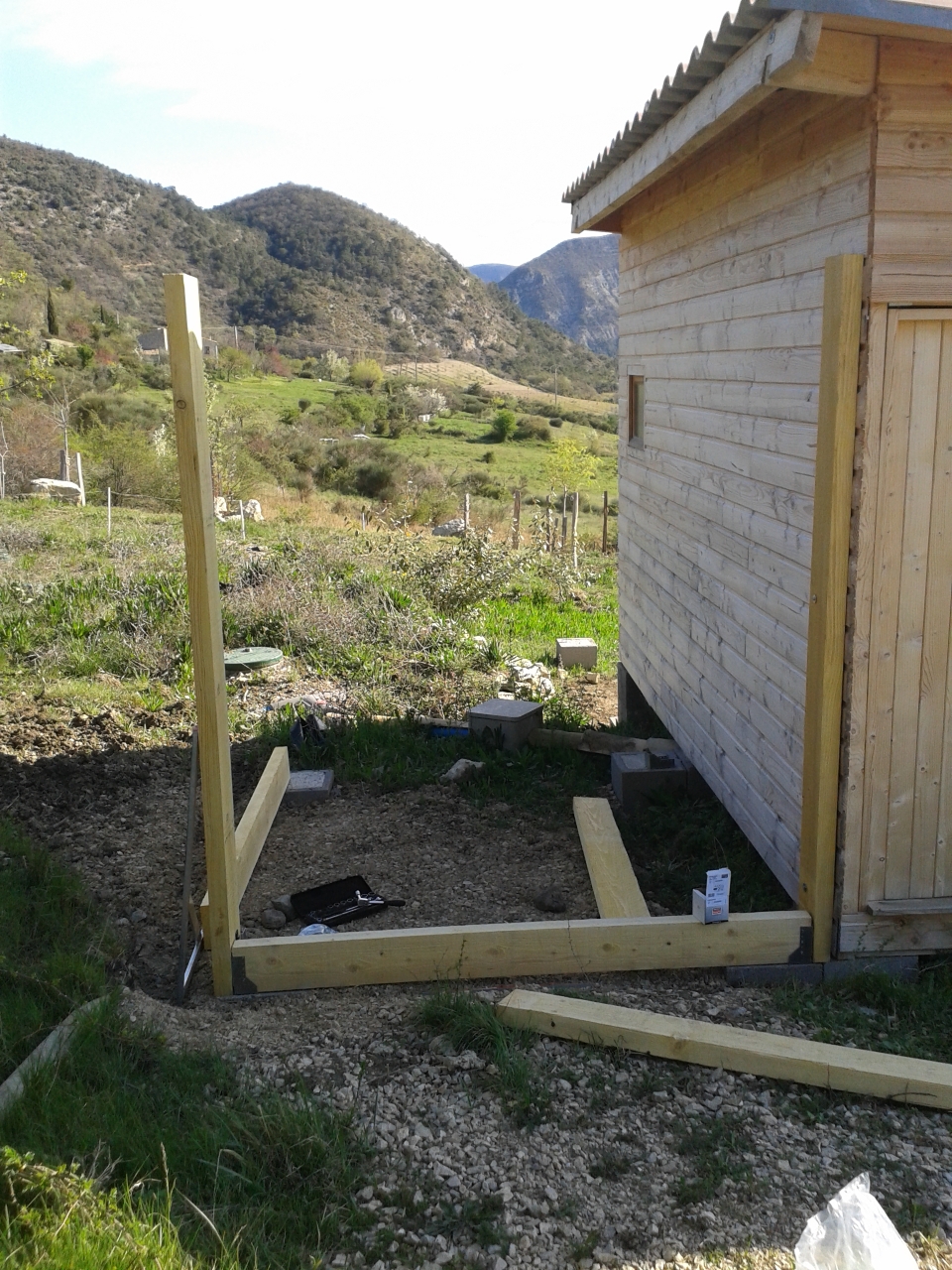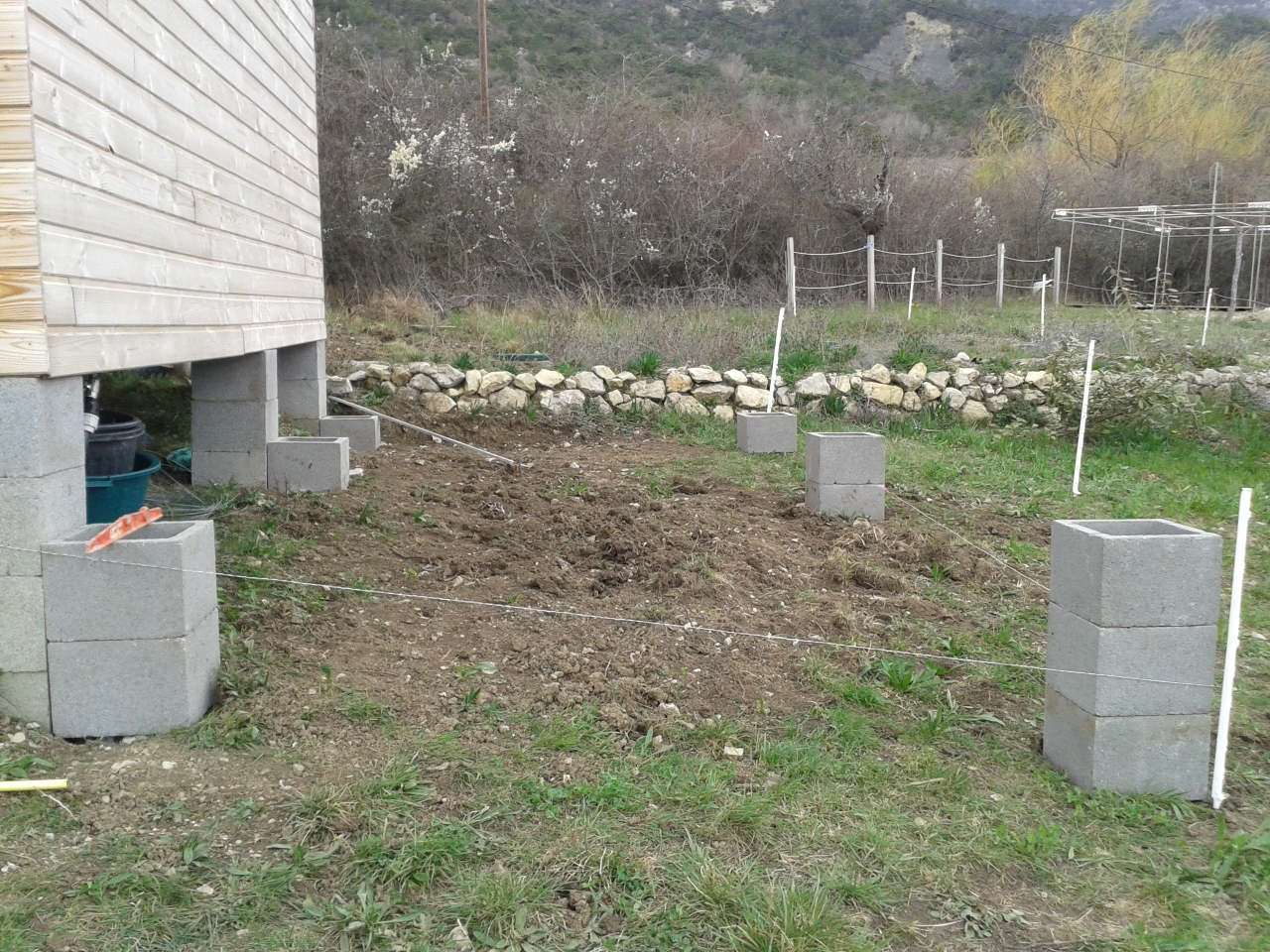 | Dire merci | Problème informatique résolu ! Commande des matériaux de construction faite et livraison prévue vers le 18 avril ! Sable livré ! Vivement que mon homme ai le temps de le déplacer mais... 60 tonnes, je pense que ce sera un peut long... !![]() Nous avons commencer les travaux pour l'agrandissement ( fondations / pilotis ) ! D'abord, le WC & la douche extérieure : ![]() Puis le côté sellerie & petite pièce : ![]() |