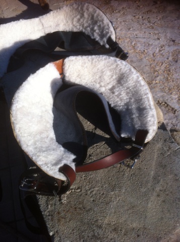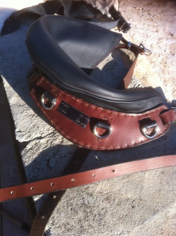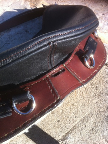 | Dire merci | Voici le même principe mais avec quelques modifications:![]() Un renfort au siège sans sur-épaisseur: ![]() Du mouton dessous pour protéger la selle des frottements et stabiliser le tout: ![]() Ca ne touche pas le dos du cheval: ![]() Deux petits passants en cuir en plus des anneaux pour passer des lanières (veste ou charvin) ![]() La fixation principale n'a pas changé ![]() Avec des sacoches pour se donner une idée: ![]() |