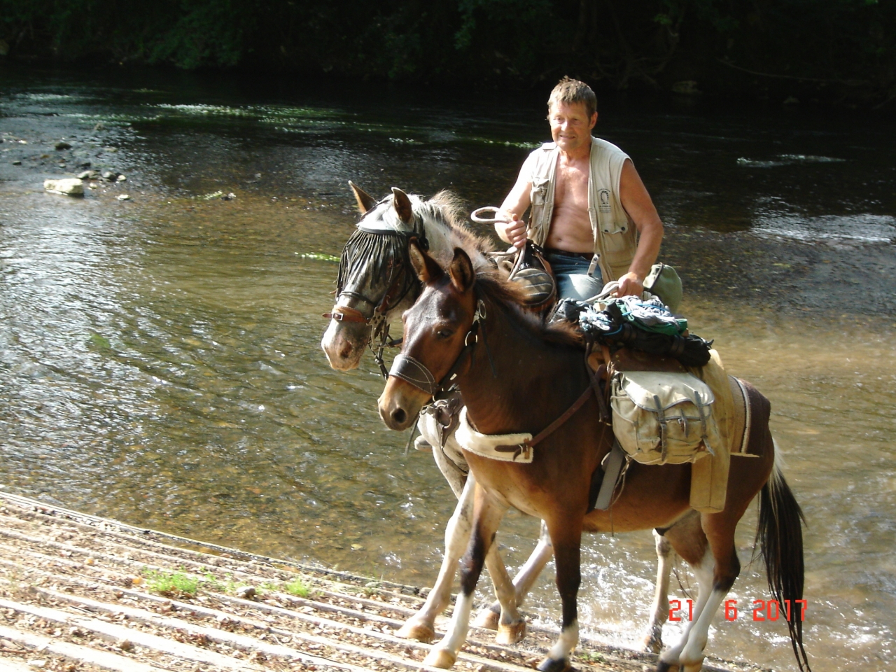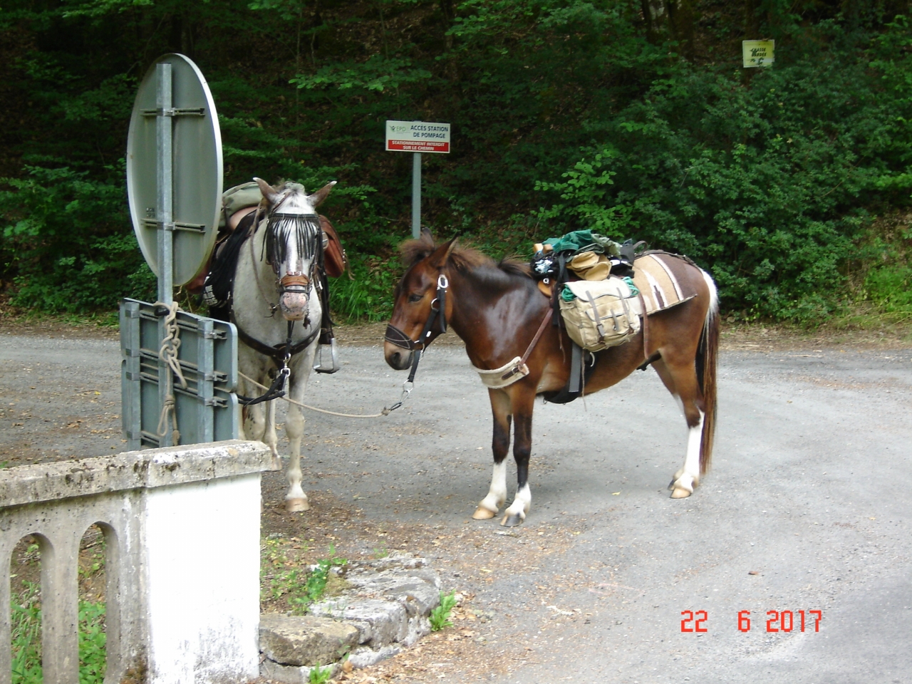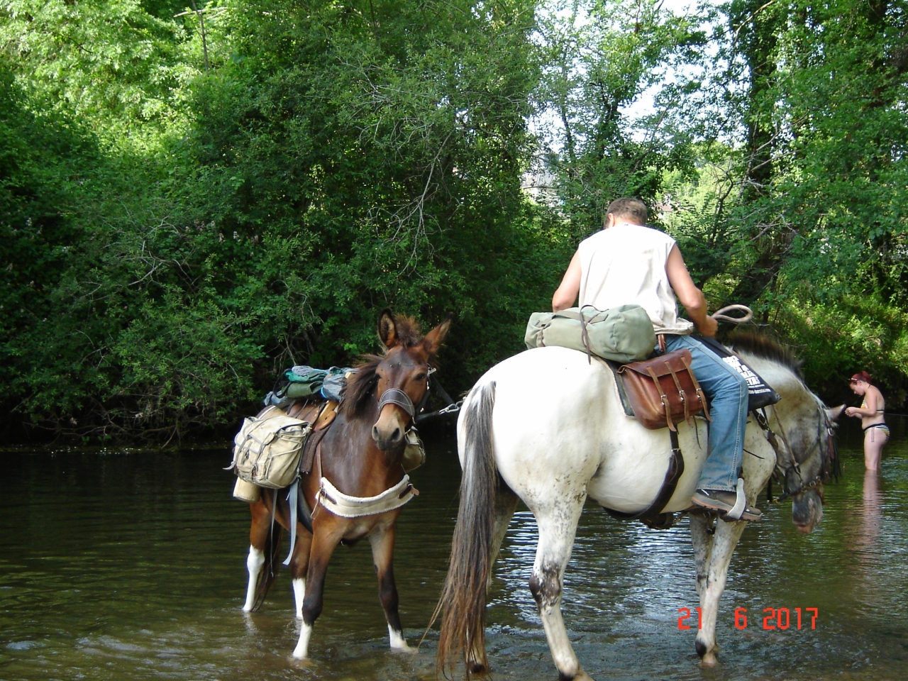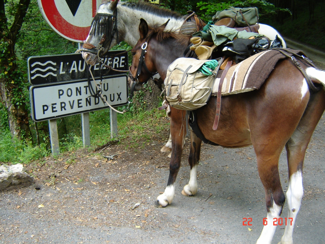 | Dire merci | Lundi 19 juin 2017,,C'est décidé ,nous partons, ma jument Kwahl 13 ans, mon mulet,Simon 7 ans et moi,(70 ans le 24 juin) Affaires personnelles et vetements et duvet dans mes sacoches et charvin,,,,,Nourriture pour une semaine, rechaud, grille, gamelles, etc dans les sacoches du mulet,,cloture electrique, piquets (arceaux de tente igloo), fil, etc dans l'autre sacoche du bât,,Boudin a grains (armée Suisse) sur le bât,seaux en toile a portée de main, Papiers ,cartes,bricoles,dans la sacoche de pommeau,,, Premiere etape Beauronne --Leguillac de l'Auche,,bivouac dans un pré, prete par un habitant (pas besoin de monter cloture, sinon un fil pour me proteger des loulous fouilleurs de sacoches!!![]() |