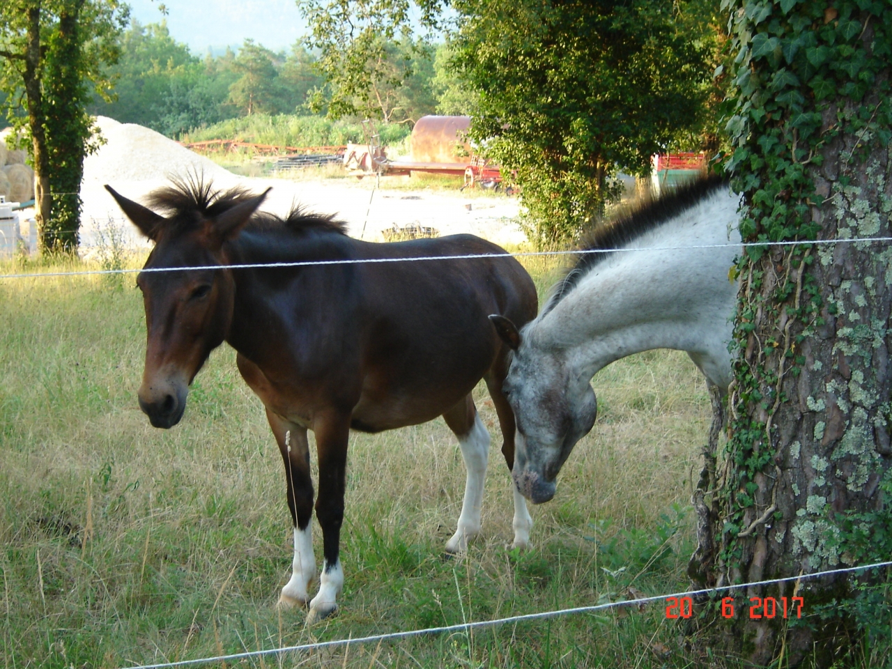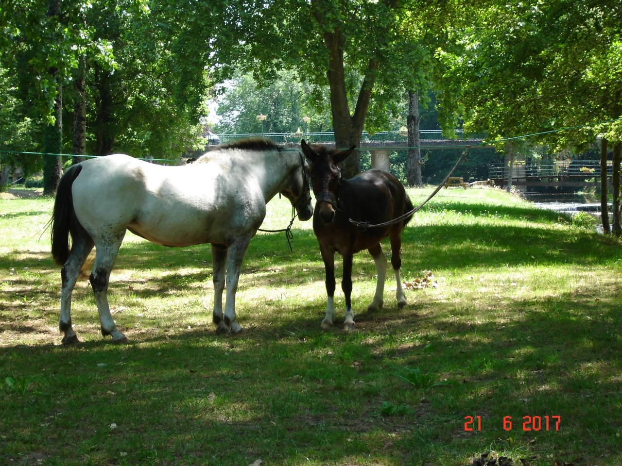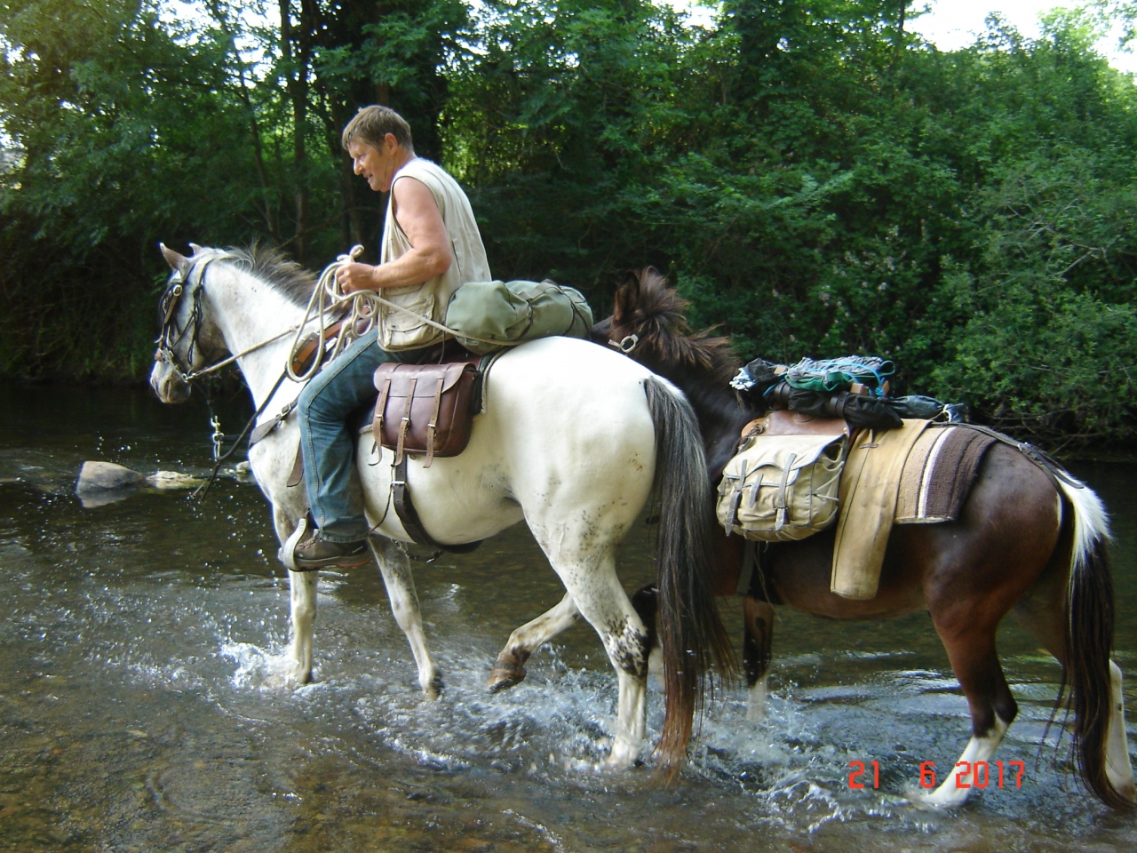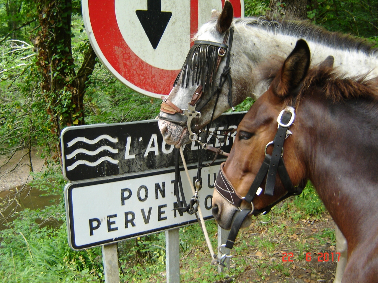 | Dire merci | Lundi 19 juin 2017,,C'est décidé ,nous partons, ma jument Kwahl 13 ans, mon mulet,Simon 7 ans et moi,(70 ans le 24 juin) Affaires personnelles et vetements et duvet dans mes sacoches et charvin,,,,,Nourriture pour une semaine, rechaud, grille, gamelles, etc dans les sacoches du mulet,,cloture electrique, piquets (arceaux de tente igloo), fil, etc dans l'autre sacoche du bât,,Boudin a grains (armée Suisse) sur le bât,seaux en toile a portée de main, Papiers ,cartes,bricoles,dans la sacoche de pommeau,,, Premiere etape Beauronne --Leguillac de l'Auche,,bivouac dans un pré, prete par un habitant (pas besoin de monter cloture, sinon un fil pour me proteger des loulous fouilleurs de sacoches!!![]() |