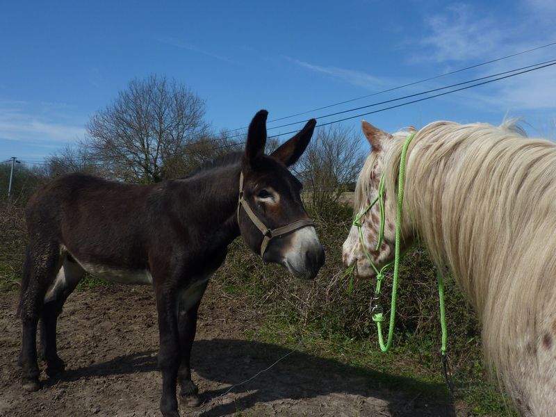 | Dire merci | il a juste un problème cet âne, on peut pas lui enlever le licol (ni lui remettre)....y a un maréchal qui lui a tapé dessus, et il ne supporte plus les hommes........avec les femmes, il ne bronche pas..... |