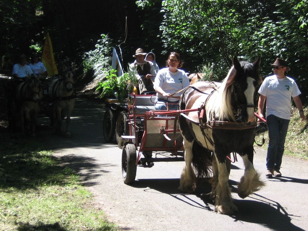| Dire merci | Vans attelés et matos chargé. Nous serons là demain matin pour 7h30. Pas de photos à mettre mais petit descriptif : une jument irish cob pie noire attelée et une jument irish cob noire. Et un chihuahua en groom dans l'attelage |