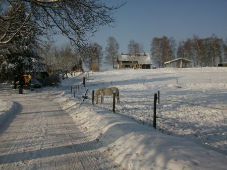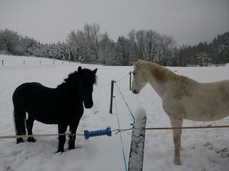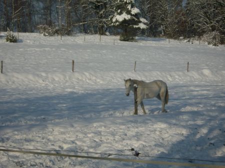 | Dire merci | Neige aussi ici en Normandie, mon cheval n'est pas ferré anti neige donc grosse galère pour les ballades que j'ai momentanément arrêtées, le temps qu'il arrête de faire un temps pourri. Du coup c papouillage ou grignotage de l'herbe qui dépasse le long du chemin. Pour l'hiver prochain je prévoies de lui faire poser une ferrure spé. ![]() |