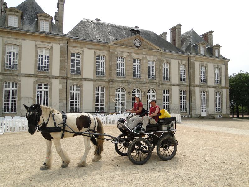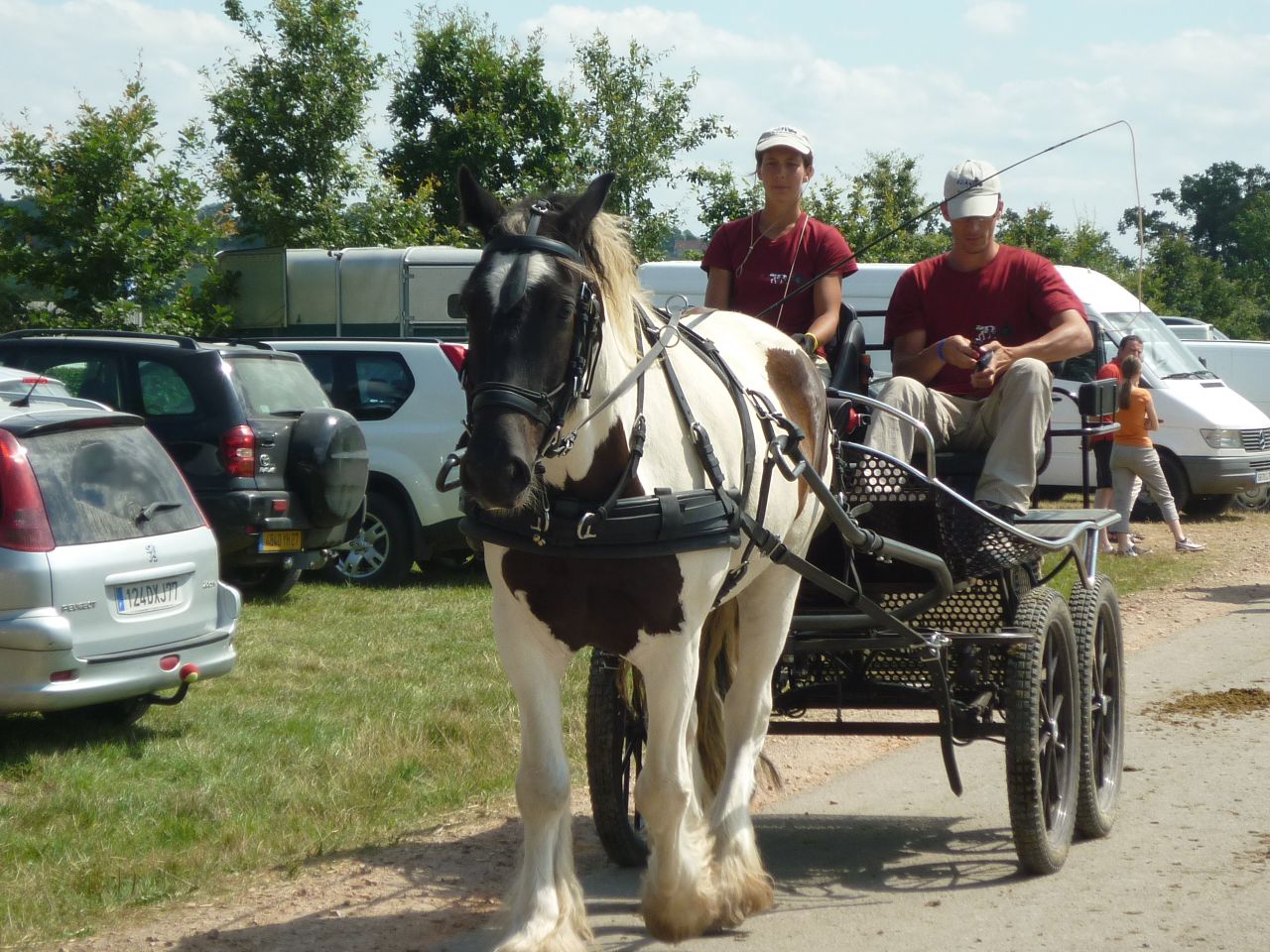 | Dire merci | Merci pour la photo ![]() Nous on a passé une super equirando et comme nous avions repéré nous n'avons eu aucune mauvaise surprise au niveau des chemins. Sur le site les paddocks étaient super bien montés, foin à volonté, granulés distribués généreusement (eh oh arrêtez mon cheval va jamais manger tout ça !!!) et mon cheval était très posé sur le site. Il n'y avait pas d'ombre mais je vois mal comment installer 900 paddocks à l'ombre et de toutes façons, ce n'était pas la grosse chaleur, sur le site, je pense que ni les humains, ni les chevaux n'ont souffert d'un manque d'ombre ! On s'est fait voler notre seau le dernier jour, j'étais dégoutée moi qui m'étais obligée à faire confiance et à le laisser dans le pré. Il a suffit qu'on aille faire le PTV et au retour, paf, plus rien. Les organisateurs ont été très gentils de nous en redonner un car normalement, après le premier, ils étaient payants. Sinon Thorgalou a été top, très courageux toute la semaine et je confirme maintenant que la randonnée en attelage c'est + dur que monté (en tous cas, quand on a un seul cheval). Il en a sué les 2 derniers jours, avec toutes ces petites mais loooongues montées... ! Le dimanche matin il était content de se dégourdir les jambes sans calèche derrière, sur le PTV |