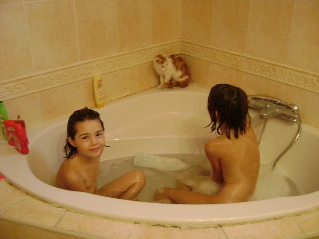 | Dire merci | Et regardez bien, il y a des remparts qui ont été posés là pour garder la bête : ce sont les bouteilles de shampoo... Heureusement, le matou s'en est sorti avec juste le bout des papattes mouillées...(on voit bien que l'être humain est de la famille des prédateurs quand même et des méchants en plus...). |