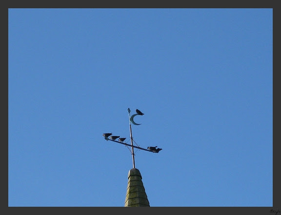 | Dire merci | Mumu !!! bleues !ici, il refait beau , j'ai photographié le clocher du village ! particularité : il est surmonté d'un croissant (et squatté par les oiseaux )![]() ![]() |