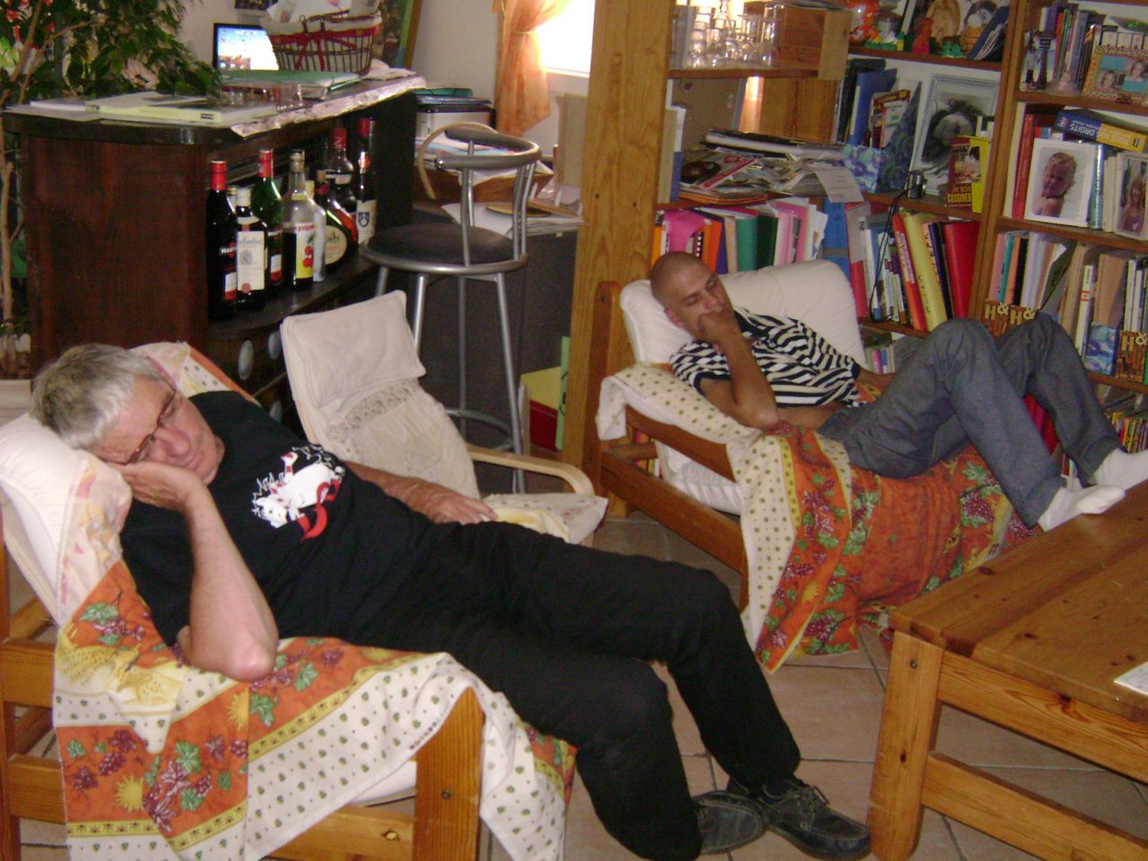 | Dire merci | Les gamines sont déjà sorties de table, Fanfan a jeté l'éponge depuis un petit moment déjà, et nos deux protagonistes s'apprêtent à faire une sieste réconfortante devant le Tour de France pour récupérer un tit peu avant la suite (Ah, chez Nath34, c'est "sportif" et faut prévoir de s'entrainer un petit peu avant de venir...) :![]() |