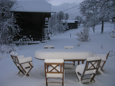 ) et que je suis infoutue de mettre la bougie, voilà une petite photo de chez nous ce matin. On ira poser nos fesses ailleurs pour boire le café. C'est chez nous, me suis pas trompée de maison...
