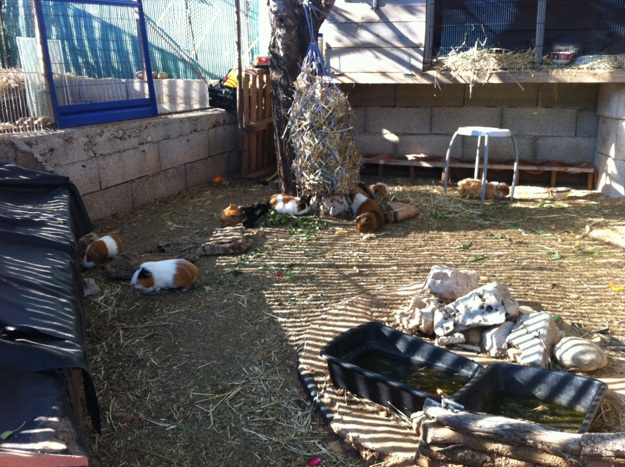 | Dire merci | Nous avons une 15aine de cochons d'inde, ils sont dans des anciens parcs à poule .... Mon mari en avait marre de tondre, donc on a mis des chonchons ...A 2, ils se tiendrons chaud , sans soucis. Nos cabanes sont sur "pilotis" et et doublées en polystyrène. Oui, c'est vite sale dans les cabanes, donc faut nettoyer souvent ou alors, faut bricoler un grille pour qu'ils n'aient pas les papattes au sale ... La dernière cabane bricolée est un "duplex", 2 entrées, 2 compartiments, séparés par un ratelier central, comme ça, ils ne gachent pas et mangent a l’intérieur ... pour les photos, faut que je vous trouve ça |