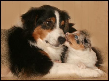 | Dire merci | pleins de courage ma Kat, j'espére que ça va aller au mieux vite et culpabilise pas tu fait au mieux !!! Oui Pitch c'est pas un petit model , on a vu deux berger australien de son age ce week end il font minus a coté.Mais du coup plus petit et beaucoup beaucoup plus speed. enfin a la différence du chien de miss rebelle on le prend pas pour une fille mais personne veux croire que c'est un berger australien ![]() on rentre d'avoir fait les rappels vaccins, bon chiot super en forme, 8 kilo et des poussière, et bin le véto il aime bien il fouille partout fait des lechouilles a tout le monde et s'assoit devant le présentoir a croquette pour avoir des bonbons. bon les 2 premiers nuit tout seul on était un peu " dur" car il a pleuré par intermittence, je m'y suis peut être mal prise on a fait avant de teste en journée, laissé de la lumiére (?) + des croquettes " caché" pour l'occupé un peu, ses jouet et un truc avec mon odeu . bon la 3 éme nuit bien par contre La quand je le laisse seul dans sa pièce même en journée, il pleure les 5 à 10 premières minutes. mais ça va de mieux en mieux. et il aime l'eau vu qu'il est aller se baigné dans le ruisseau au écuries ... du coup il a testé le séche cheveux / chevaux des écuries . |