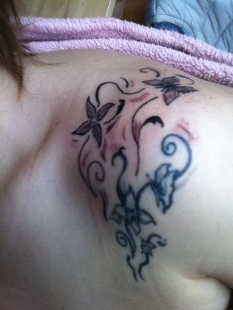 | Dire merci | celui ds mon dos a mit plus de temps car il y avait beaucoup d'ombrages, de couleurs,... mais mon papillon en 3 jurs c'était top pour ma part, le scotch du sparadra me fait plus d'irritations que le tattoo en lui-même dc demain retouches,.... j'avoue que j'ai très envie d'un nouveau tatoo |