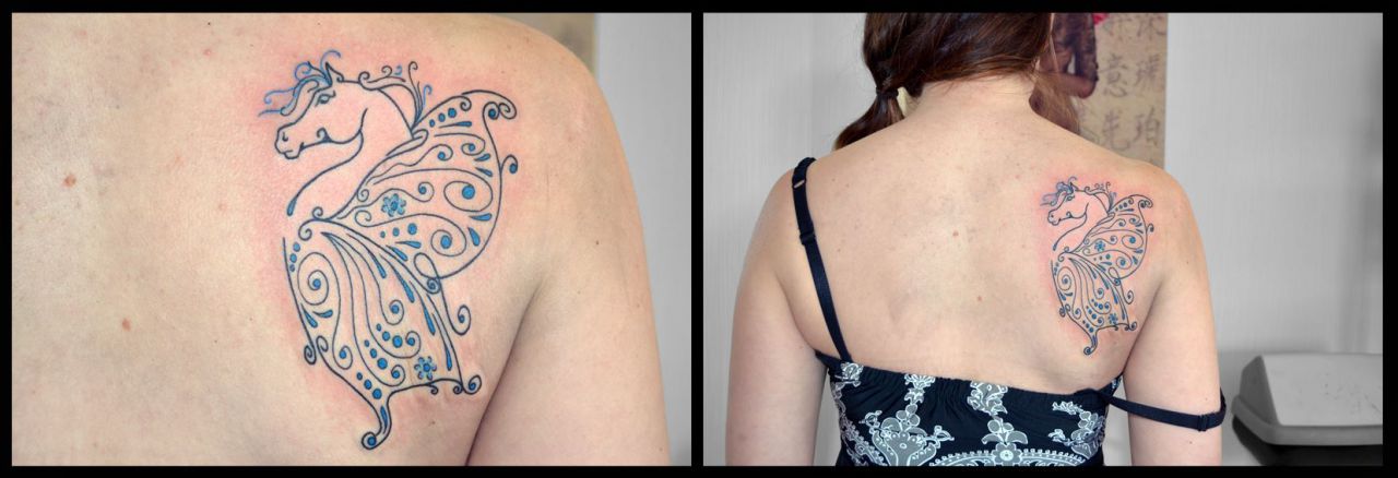 | Dire merci | voilà les retouches de mon papillon faites cet aprèm ! Laska, ça dépends des sujet pour la cicatrisation pour ma part en 1 semaine (large) c'est réglé pour les soins, mets des cmpresses nn tissées et de la crème a tatoo (après avoir lavé et désinfecté avec les produits appropriés bien sur) |