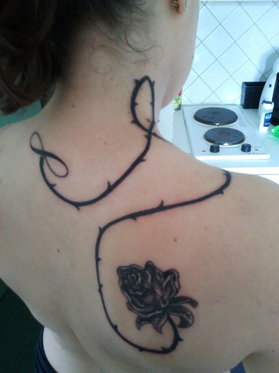 | Dire merci | Mon tatouage passe dans le cou, sur l'omoplate et va jusque sous la nuque ... Niveau douleur, dans l'ordre de la douleur la plus importante à la moins importante : - le cou - la nuque - l'omoplate L'omoplate, à part au début où c'était la première fois que je sentais une aiguille encrer ma peau, ce n'était pas douloureux ![]() Par contre le cou, j'avais l'impression que jamais ça ne s'arrêterait ... Mon tatouage pour visualiser la chose ![]() |