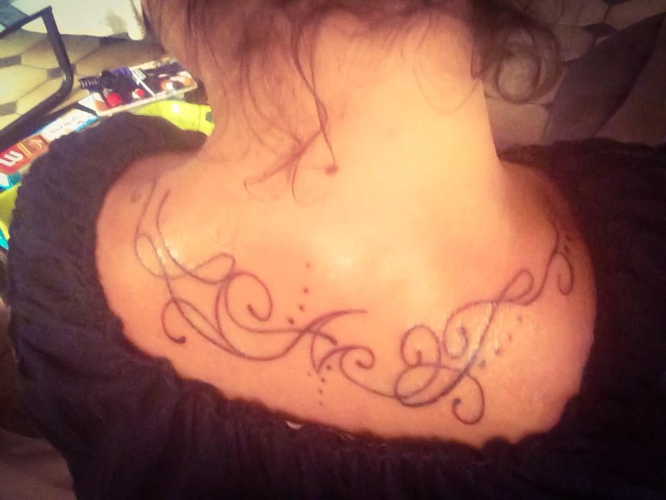 | Dire merci | les initiales de mes parents, mes frères et ma nièces !!! je le fais dans le dos, dans le même style que mes autres tatouages ![]() |