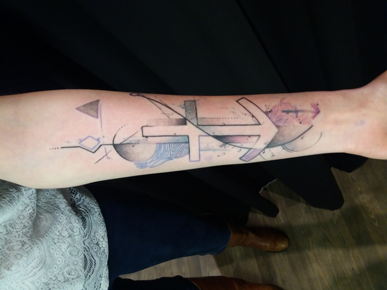 | Dire merci | Merci, je voulais un truc géométrique, je ne suis pas déçue! Et tous les motifs en couleurs ont été choisis au freestyle par le tatoueur, en écoutant mon avis du moment c'était trop chouette cette "collaboration" en live! ![]() |