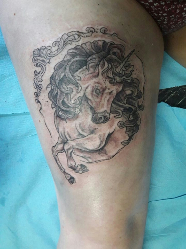 | Dire merci | river pour tout dire c'est un pur dessin de ma tatoueuse elle l'a fait en flash j'ai craqué et voila comment elle arrivée sur ma cuisse bon la j'avoue la photo est pas top prise en fin de seance toute gonflée je reprendrai une photo une fois qu'il sera cicatrisé et pis surtout faut qu'il s'eclaircisse un peu Message édité le 24/10/17 à 16:44 |