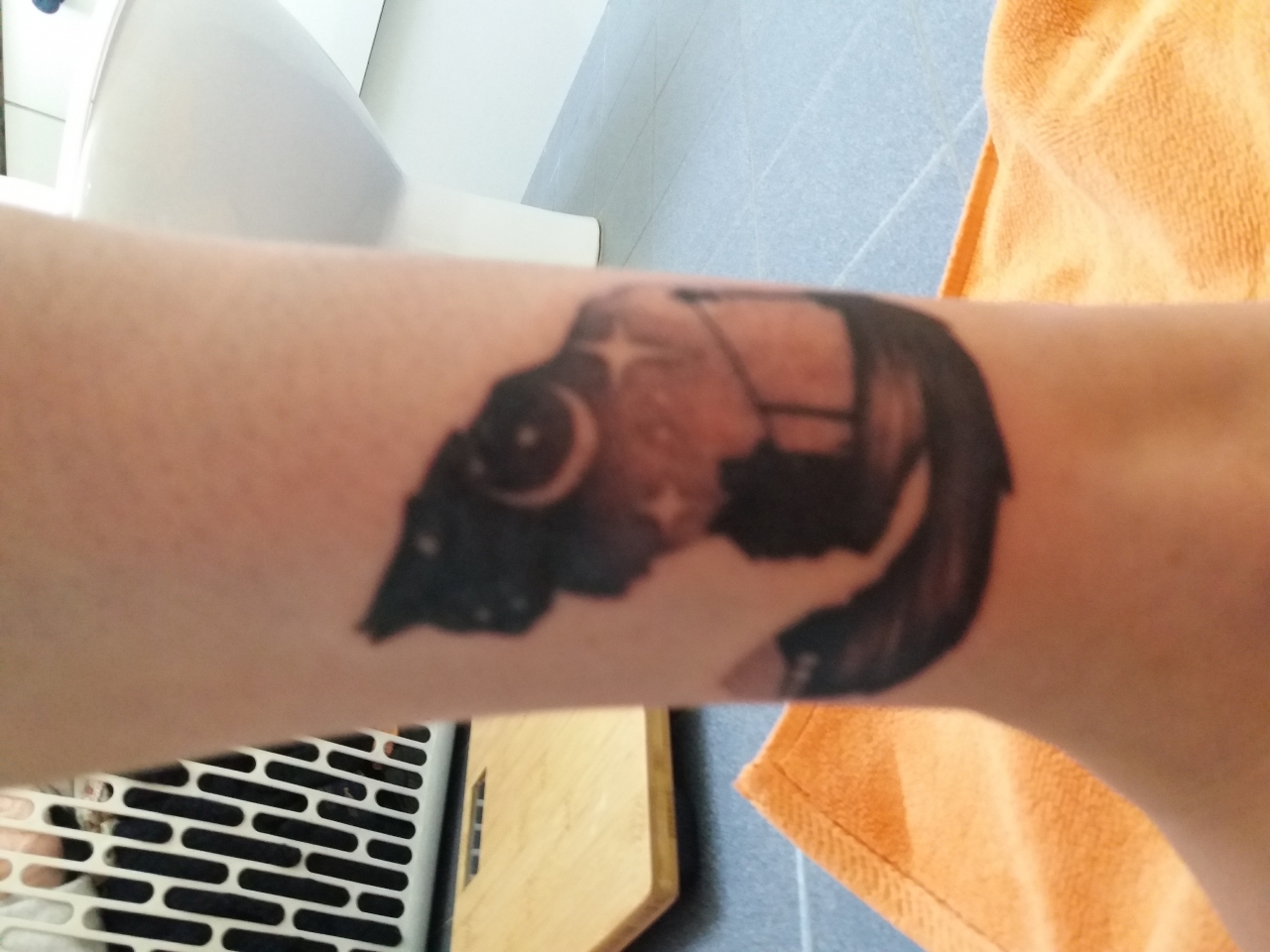 | Dire merci | Ben moi je n'aimais pas du tout les tatouages à la base jamais revé d'en avoir un, j'aimais bien ceux dans le bas du dos mais c'est tout. Et quand mon homme est décédé je ne sais pas pourquoi l'idée s'est mise dans ma tete et ne m'a plus quitter je voulais qqchose de nous sur ma peau, du coup comme l'arbre de vie était déjà le symbole de notre famille et de notre élevage de chevaux ben j'ai eu l'idée d'y ajouter nos initiales. Et je l'ai fais à l'intérieur du bras car j'avais le besoin de le voir. Et puis celui du poignet parce que j'avais aussi envie que mon cheval fasse parti de moi pour toujours |
