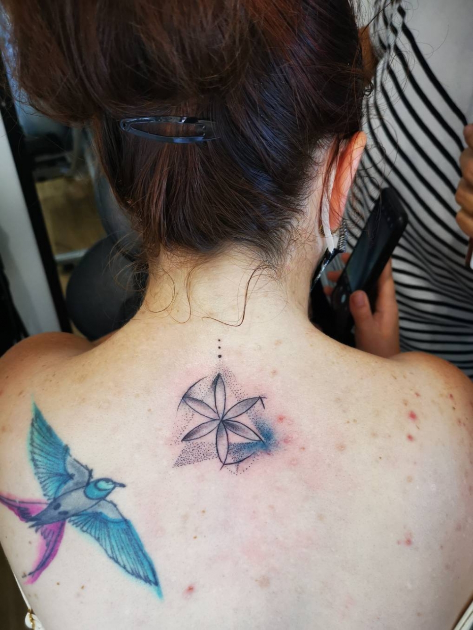 | Dire merci | Petit dernier :![]() Même motif pour ma mère et ma sœur. Il y a juste les couleurs qui change. Ma sœur a une autre couleur côté gauche du triangle et ma mère les deux couleurs. Je pense que mon dos sera réservé à la famille (l'hirondelle étant pour ma grand mère) |
