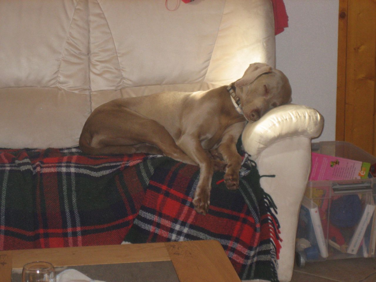 | Dire merci | Un weimar, ça part en vacances à la montagne:![]() Ca se repose dans le canapé après des heures de balade... ![]() |