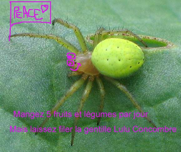 | Dire merci | LESSON 2 : le monde VIP des épeires L'épeire est la deuxième Lulu à laquelle nous allons nous intéresser, elle est très courante sur le rebord de nos fenêtres. De très petite taille, elle tisse sa toile au soleil chez nous à défaut de pouvoir se payer l'avion pour Ibiza. Elle a gros ventre dodu qu'elle assume très bien, dont la couleur et les délicats motifs estampillés JP Gauthier varient d'une Lulu à l'autre. Les épeires sont coquettes ! Leur côté prout prout ne les empêche pas d'être l'insecticide biologique le plus efficace pour débarrasser nos longues soirées d'été des moustiques, des mouches à confitures et des autres visiteurs indésirables ! Voyez l'épeire comme votre mini-garde du corps. Une seule épeire a du offenser le dieu des Lulus car elle se retrouve affublée d'un nom peu distingué : l'épeire-concombre. Encore appelée lulu-courge, elle détonne dans le monde plutôt BCBG des épeires. C'est ce vilain petit canard que je vous mets en photo ci après. Vous remarquerez tout de même que son vert reste assez à la mode. On en se refait pas.Devoirs pour demain : en dix lignes imaginez quelle bourde a pu commettre l'épeire concombre pour devenir la risée de tout le gotha épeirien. Devoir subsidiaire : relookez l'épeire concombre de façon à la mettre en valeur lors du prochain bals des princesses. A bientôt pour le lesson 3 ! |