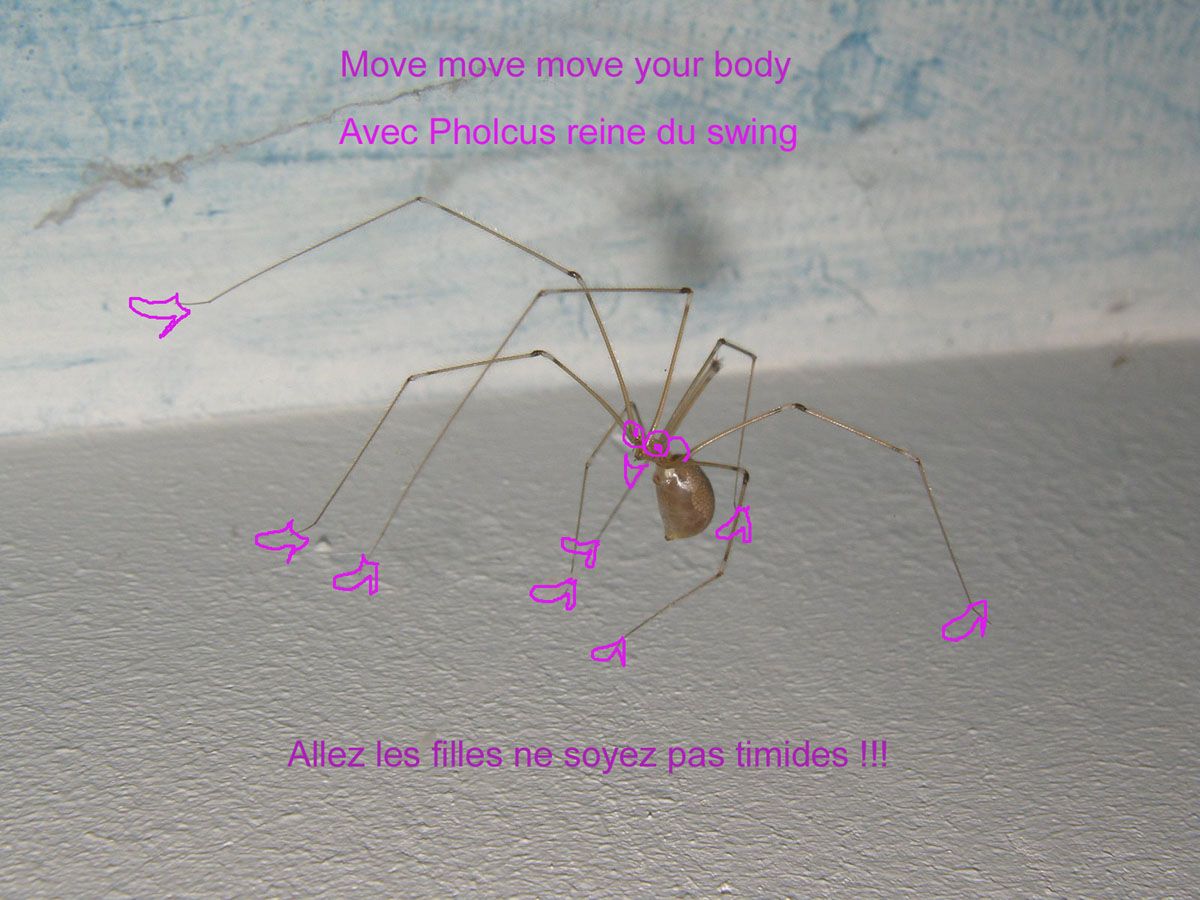 | Dire merci | LESSON 3 !! : sur le dance floor avec Pholcus reine de la nuit- Bonjour Pholcus - Bonjour les Lulu-thérapeutisés - Alors, pour nos amis qui nous lisent, pourriez vous vous décrire en quelques mots ? - Ouiiii... J'ai de looongues papattes formidables, beaucoup plus longues que mes congénères habituelles, sauf peut -être Opilion, mais elle n'a pas mon swing ni ma ligne parfaite ! Je fais 90-60-90, je suis l'Adriana Karembeu des Lulus. - Et que faites vous avec vos longues papattes ? - I dance all night dans votre salle de bains. Mais ne craignez pas que je vous insuffle le move en vous touchant, car je reste indéfiniment dans ma toile, my private dance floor. Quand un danger menace ou que j'ai besoin de sentir la Wave en moi, je fais trembler ma toile à toute vitesse et cela donne le tournis aux plus fidèles de mes admirateurs ! - Et pourquoi la salle de bains ? - Mais.. parce que je suis une fille, voyons ! Et mes amants ont eu aussi intérêt à se raser sous les bras, dans le monde du groove on n'aime pas les poils sous les aisselles. Je tisse ma piste de danse dans un coin tout près du plafond, et je m'y accroche la tête en bas car c'est plus fun plus hype plus dance quoi ! - Et trouvez vous un certain succès vers les mâles, avec votre talent dance... dancique ? - Ah ah ah ! Ils sont tous foooooous de mon corps qui pulse en rythme. Mais je vais vous dire un secret : quand ils draguent, ils s'approchent prudemment, car dans le feu de la dance j'aurais vite fait de les confondre avec un succulent moustique ou même une petite araignée délicieuse... Pour se présenter, il move avec moi selon un tempo particulier, et c'est partie pour une nuit de foliiiie ! D'ailleurs, je vois que Steve m'attend... Si vous voulez bien m'excuser... - Bien sûr ! Merci Pholcus - Vous êtes un chou, à bientôt dans un coin du plafond, et n'oubliez pas : la reine du move, on ne la touche qu'avec les yeux... Je ferai de même avec vous. Tchuss ! |