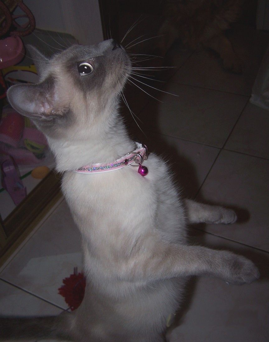 Déconnecté | ah oui elle a son collier rose a paillettes avec le grelot (indispensable pour les siamois, sinon mon assureur ne la prenait pas en charge. nan parce que pour les siamois l'assurance c'est obligatoire ne serait ce que pour les gadins-tentatives-d'esquive-de-chat-dans-les-jambes) |