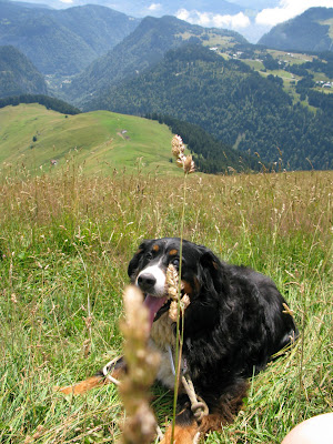 | Dire merci | Des photos, des photos! After il est toujours aussi beau. Alors la nôtre elle craint la chaleur, le jour de cette rando en montagne (sur la photo) une malheureuse rando de 800 m de montée on a failli la tuer je m'en suis beaucoup voulue, je ne pensais pas qu'elle craignait autant la chaleur Elle est en laisse parce que c'est un alpage et que c'est obligé parce que ce n'est pas le genre de chien à courir après le bétail. |