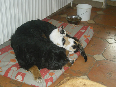 | Dire merci | mon premier boubou aussi dormait avec un chat sur le dos :-) Dante lui ben il les adore les leche joue avec eux mais il ne dors pas avec eux, lui c'est un chat c'est bien pour jouer mais pas pour dodo trop instable lol |