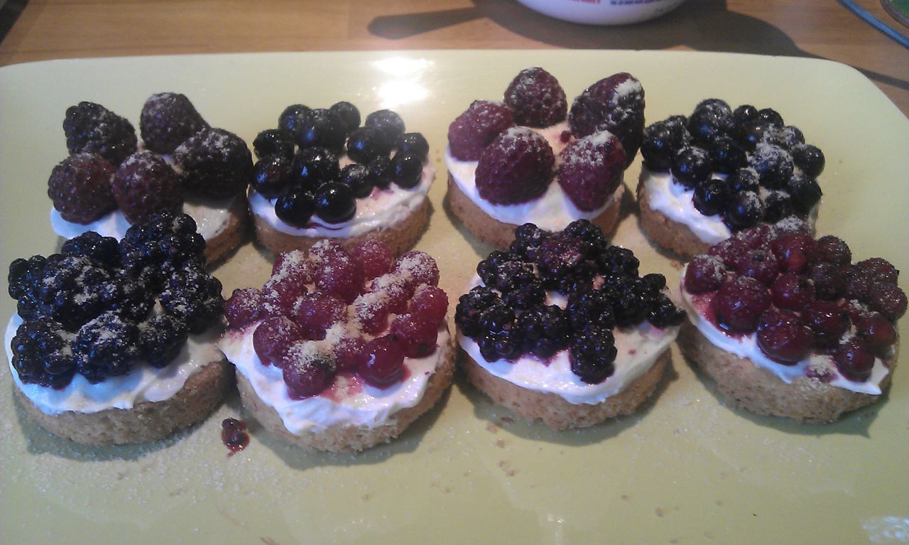 | Dire merci | - Palets aux fruits rouges • 150 g de mélange aux fruits rouges surgelés (j'ai acheté ça chez Simply, Auchan a aussi, c'est bien pratique) • 8 palets bretons • 23g de mascarpone • 1 petit suisse à 0% • 1 cc d'édulcorant en poudre • 1 sachet de sucre vanillé Mélanger le mascarpone et le petit suisse avec l'édulcorant et 1/3 du sucre vanillé. Etaler cette préparation sur les palets. Mettre les fruits rouges et les saupoudrer du reste de sucre vanillé. Voilà c'est prêt ! Très facile à faire et trop bon ! |