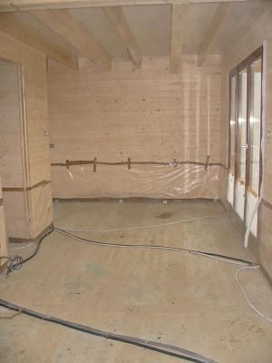 | Dire merci | Non ce n'est pas du lamelé collé mais du lamelé clouté. Comme il y a plusieurs couches (une verticale, puis une horinzontale, puis une verticale, etc) même si ça se dilate l'air ne peut pas passer. Et nous n'avons pas de chauffage électrique mais un poêle à bois. Pour le bois à l'intérieur, il devait normalement rester apparent, mais pour diverses raisons nous devons finalement le recouvrir en partie en placo (pour des raisons financières) et en partie en lambris. |