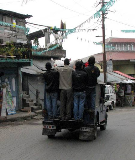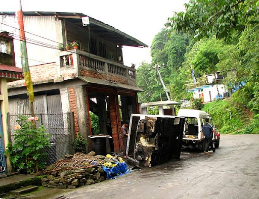 Nous partons donc vers midi pour Darjeeling (en fait, on est à environ 8km du centre ville), à moto, 8km durant lesquels j’essaie de prendre quelques photos… alors allez prendre des photos à moto, sur une route défoncée, quand on est à moitié dans un nuage ! J’espère que vous ne m’en voudrez pas pour la piètre qualité qui en résulte… D’ailleurs, j’ai fait quelques vidéos pour vous montrer comment ils conduisent en Inde, je ferai un montage à mon retour en France ! Le centre de Lebong (notre village) Une photo sur la route… oui, cela ressemble beaucoup à une voiture sur le côté, sans les roues…mais aucune idée de ce que c’est L’entrée de Darjeeling, entre les immeubles en ruine/reconstruction et les couleurs chatoyantes des « nouveaux » immeubles Arrivés à Darjeeling, nous sommes complètement dans le nuage ! Cela dit, avec les arbres, ça donne quelques jolies photos, on se croirait à Rivendell… Darjeeling, dans le nuage… Ces fameux petits drapeaux (verts blanc jaune, couleur du Gorkhaland, autrement dit la région qui réclame son indépendance) D’ailleurs, un panneau comme on en voit à tous les coins de rue. Ils sont indépendantistes, mais plutôt pacifiques par rapport à leurs homologues du Cashemire, eux se contentent d’organiser, de temps en temps, d’énormes grèves généralisées, qui paralysent complètement la région. Pas agréable, certes, mais toujours mieux qu’un attentat à la bombe… Les taxis collectifs… à vous de deviner combien de personnes maximum rentrent dans une Jeep ! Perso, j’ai pas encore réussi à compter jusqu’au bout ! *suite* |