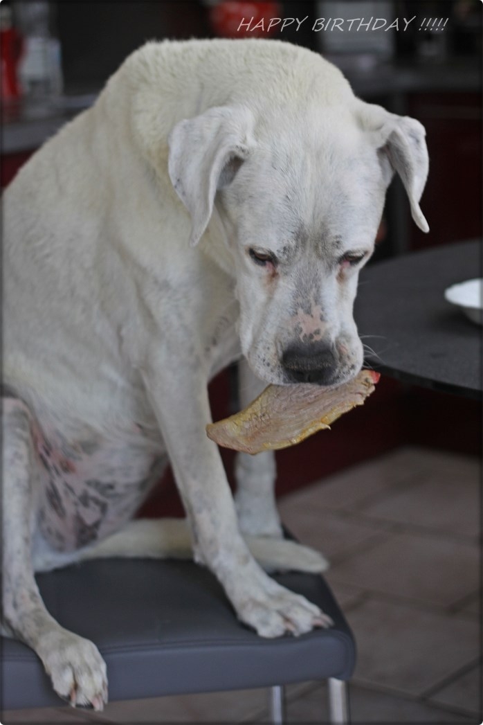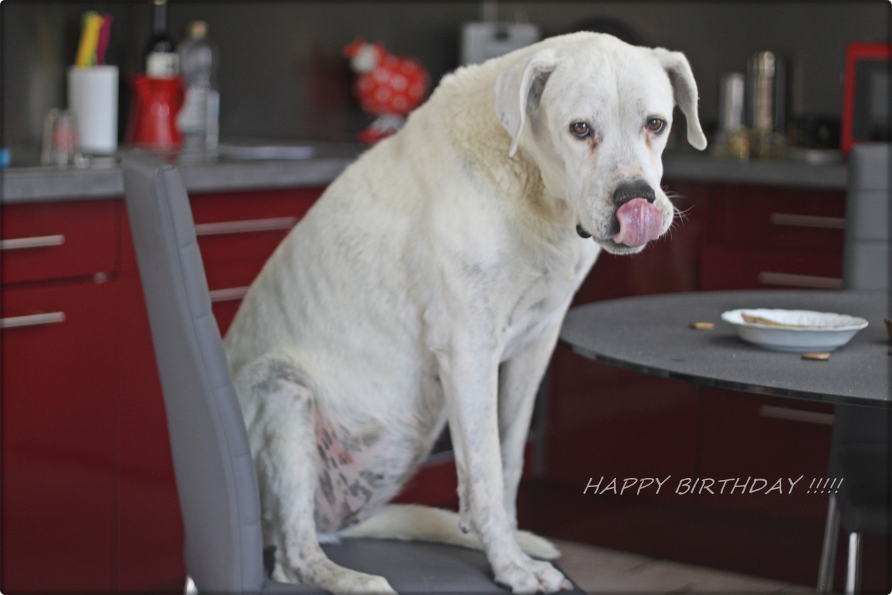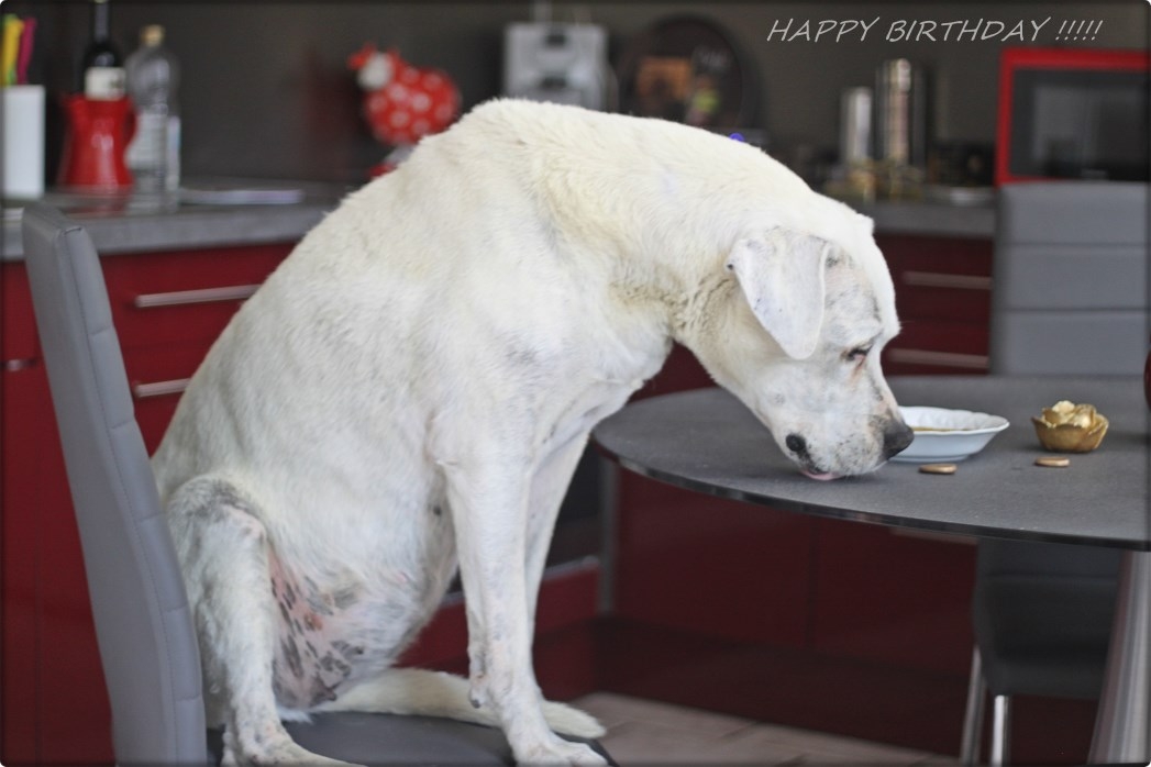 | Dire merci | coucou plush alors comment va Dali ? Bon et bien voilà le jour si attendu arrivée de l'anniv' de ma toune !!!! 12ans aujourd'hui ma puce et comme promis des photos ! elle a été gâtée : rumsteack au menu ![]() ![]() elle osait pas y toucher ... ![]() quand soudain : ![]() elle s'est trouvée bête une fois le morceau de viande chipée ! elle osait plu rien faire ! |