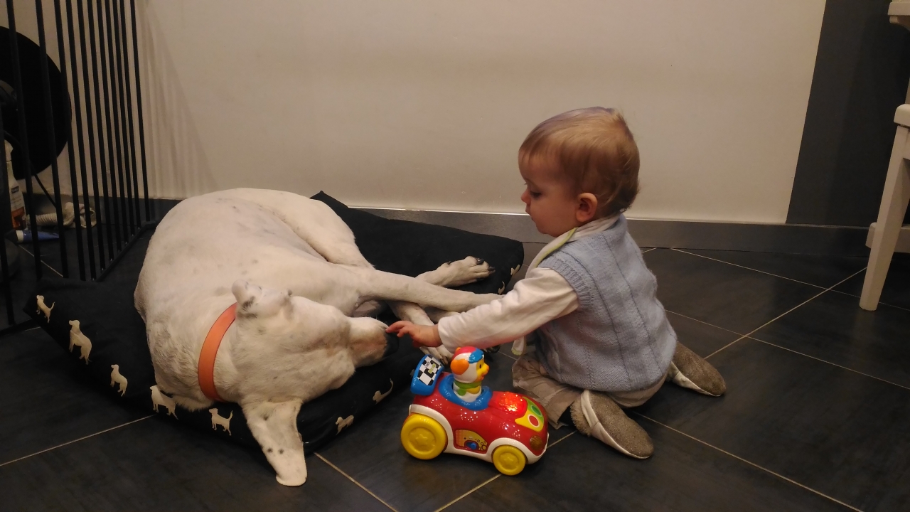 | Dire merci | merci swann quand je vois ta dernière photo avec ton BB plush ... le dogo c'est ça ! une gentillesse à toute épreuve , Val Tess comme sa maman Te Quiero adoraient les enfants, toujours douces et délicates . Elles imposaient force , puissance mais savaient être si douce ! Je continuerai à suivre ce post et vos dogos , en la mémoire de mes belles alors n'hésitez pas à le faire vivre !! maud paloo je compte sur vous pour continuer d'animer aussi ce post ! |