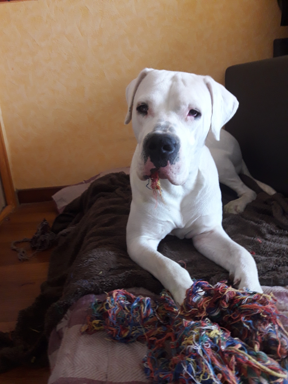 | Dire merci | Je suis comme toi, tout ce qui est chien de berger à courir partout dans tous les sens ça me fatigue. Son sac de croquettes fait un mois environ. Après la mienne c'est une princesse, elle n'aime pas le froid ni la pluie ( sauf si c'est l'heure de la balade journalière ) les dogos ne sont pas tous comme ça. Jaya ne vient d'aucun élevage, elle n'est pas lof mais pur race. Sincèrement, elle prends un peu de place à la maison mais elle passe la majeure partie de son temps sur son lit à dormir. Alors entre un dogo de 43kg tranquille dans son coin ou un berger de 20kg qui passe son temps à faire des allers retours dans la maison, je ne pense pas que ce soit le plus gros le plus encombrant. |