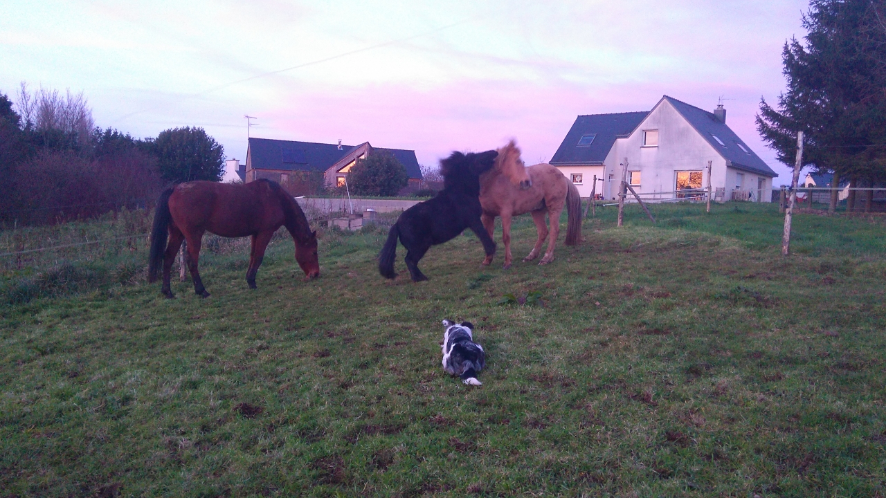 | Dire merci | Pour moi, pas de problème, en général ils s'en désintéressent d'eux même (ils préfèrent jouer entre eux). Mais je refuse qu'ils soient dans mes pattes quand je m'occupe d'eux, on sait jamais. Par contre, Jax veille vachement, j'ai été bousculée une fois par une jument et il était tout de suite au taquet et il a chiqué à 3 cm de son nez. Je l'ai renvoyé en dehors du pré parce que j'ai eu peur qu'il se fasse latter et que je considère qu'il n'a pas à prendre la décision d'intervenir. Jazzy elle en a rien à carrer, elle reste de loin et surveille Après quand les chevaux partent en couille, c'est dur dur pour eux Mais ils ont l'immobilité couchée, connaissent les limites des clôtures et ne cherchent pas à entrer sans y être invités (bon des fois ils testent, des fois que ça marche ) |