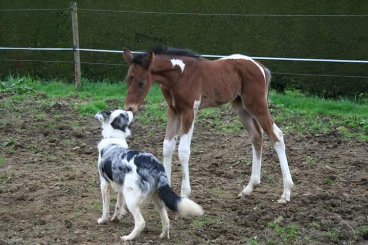 | Dire merci | Mes chevaux sont a la maison et ma chienne vit avec eux. Elle ne rentre pas dans la maison mais à un boxe pour elle juste à côté d eux. Depuis toute petite elle prenait mon mini shet pour un copain. A 3 mois il lui a marché sur la patte, 2 doigts cassés du coup elle a pris ses distances. Mais elle est quand même super au taquet sur mon shet et joue toujours avec lui, il l'a charge, elle le charge... Elle n essaie pas de ressembler les chevaux elle leur court après et autour. Message édité le 28/01/16 à 13:34 |