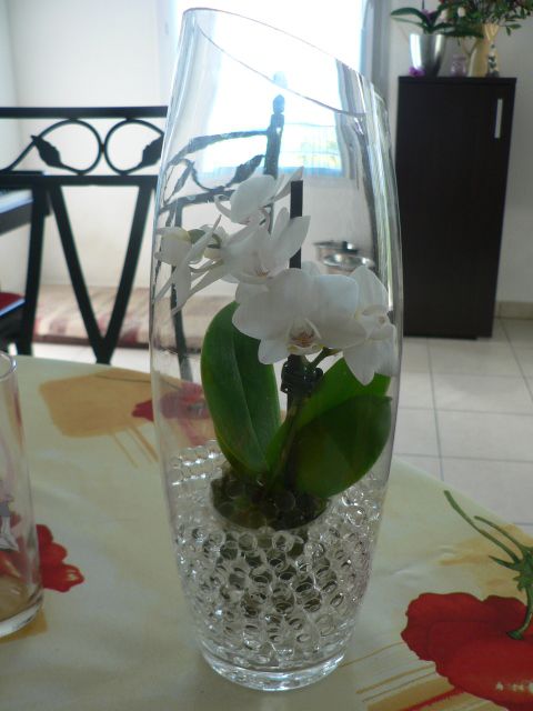 DéconnectéDire merci | Moi j'aime bien la bleue, même si c'est clair que ça fait pas naturel ![]() Mon chéri m'en a offert une nouvelle : une blanche, toute pitite (genre miniature, elle doit faire 20 cm de hauteur en tout, petites feuilles, petites fleurs). Elle est dans un "vase" en verre (toute la plante est dans le verre), et son pot est dans des espèces de bulles d'eau. A la jardinnerie, ils lui ont dit qu'il fallait sortir l'orchi de son vase pour la faire tremper pour l'aroser, mais apparemment les bulles sont pleines d'eau, et le pot de l'orchidée est bien humide, donc je pense pas que ce soit nécessaire de l'arroser ![]() En plus, en la sortant j'ai peur d'abimer les fleurs / feuilles... |