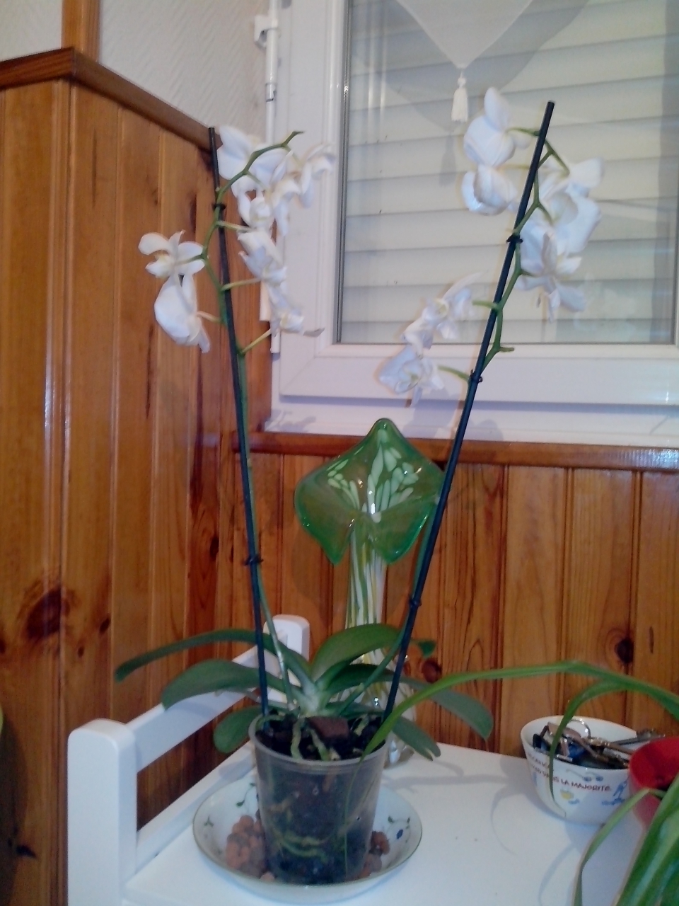 | Dire merci | Merci pour tes conseils, Bien sûr, la plante est désormais, hors des coups de fourchettes !! Je sais même pas comment elles ont pu avoir l'idée de faire ça ?? Je ne l'ai jamais rempoté, donc à part l'écorce, je ne sais pas ce qu'il y a dedans...Elle a été achetée dans une jardinerie. Je l'arrose tous les 15 jours à peu près, je laisse couler un peu l'eau du robinet dans le pot, l'eau ne stagne pas. Elle est toujours dans ma cuisine qui est plutôt à l'ombre. Je suis entourée de forêt, il fait clair dans mon appart mais j'ai rarement du soleil. J'ai l'impression qu'il y a un début de hampe (dsl je sais pas si c'est le bon terme), on le voit sur la hampe de gauche, en dessous le keiki. D'ailleurs, je pensais que les plantes faisaient des keikis lorsqu'elles se sentaient bien... J'attends alors les racines avec impatience mais, les feuilles poussent depuis au moins 8 mois, voir plus, mais toujours aucune racine |