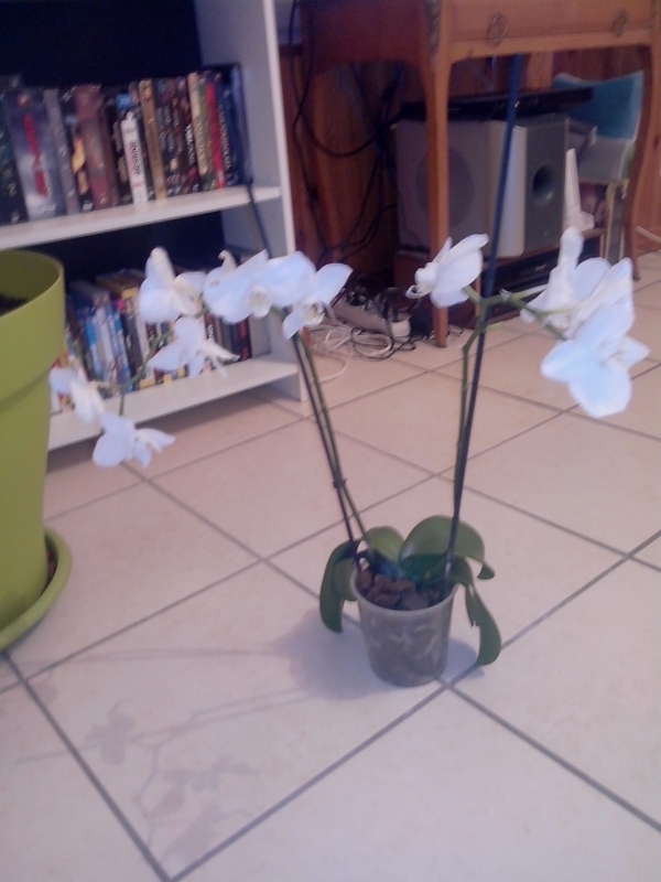 | Dire merci | Pas de poubelle lapatateuh tant que tu as des feuilles! Pour la sortie dehors : pour les phals, ça doit être à l'abri de la pluie (sinon ça pourrit au cœur) et du soleil (sinon ça cuit, tu as déjà testé!). Ta feuille marron est sèche? Si oui c'est un coup de soleil, rien à faire, c'est pas très grave, juste inesthétique. Tes feuilles molles, c'est probablement une plante assoiffée. Vu ce que tu nous as dit (eau stagnante dans le fond du pot), c'est probablement à cause des racines qui ont pourri. Tu arrosais tous les combien de temps? Bref, tu dois dépoter pour voir l'état des racines, couper tout ce qui est mou pourri. Laisser sécher 24h à l'air libre puis rempoter dans un tout petit pot avec les écorces que tu as (si bien dures, sinon il faut en racheter...que des écorces, pas du mélange spécial orchidees ou alors trier les écorces dans celui ci) en les rinçant bien avant. Tu mets à la lumière (sans soleil direct) au chaud et tu attends (arrosage toutes les semaines en trempant le pot 15 minutes). Pour aider tu places sur une soucoupes avec des billes d'argiles constamment humide. C'est le printemps, les racines devraient repartir d'ici 1 mois ou 2 au pire. N.b. : il faut inspecter le tronc : s'il est mou et noir, c'est une pourriture au cœur (souvent due à un arrosage de la plante par le dessus, or on arrose le substrat, pas la plante) et là c'est poubelle! ![]() |