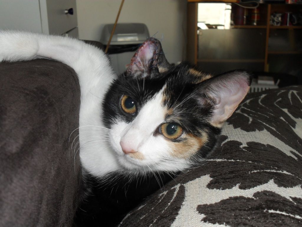 | Dire merci | j'ai un peu de mal moi, mais c'est surtout du au fait que je vois les fils (et je suis une grosse chochotte) et aussi parce qu'elle est rasée de l'oreille. Mais quand je vois la seconde photo ou l'on ne voit pas trop tout ca, je la trouve plutot mimi avec sa demie oreille ^, |