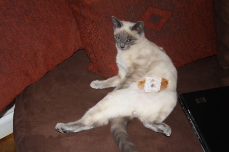 | Dire merci | ma petite minette c'est opéré pour ne pas avoir de petit :la voila dans ça position favorite pour nous montrer que ça fait bobo quand même :![]() " alt="" /> |