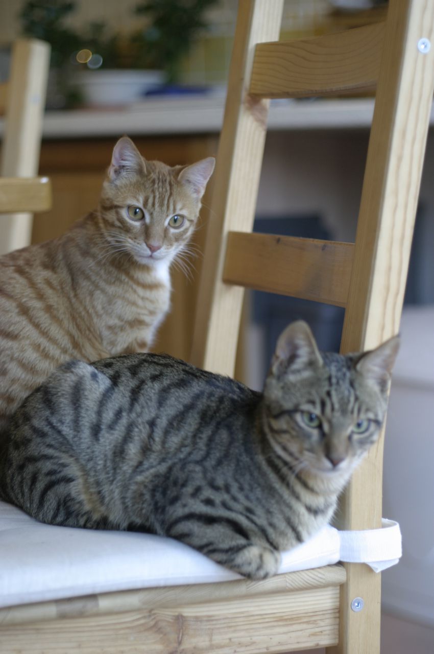 | Dire merci | Monsieur est bien arrivé. On l'a laissé près de 2h tout seul, puis on a introduit le premier chat. Ça crache, ça miaule, ça roucoule, ça donne 3 coups de pattes. Et puis ils prennent leurs distances. Et s'observent. Au bout de 2h on a introduit la minette. Bon, minette est un peu "spéciale", dans le sens où elle n'a que deux neurones et demi qui s'entrechoquent de temps en temps. Bon, résultat, je la tiens, elle regarde sans rien dire. Je la lâche elle lui a littéralement foncé dessus Mais pas méchant, sans grogner, sans poils sur le dos, sans cracher. Elle a juste courue comme une balle dans sa direction. Lui ne s'attendant pas du tout à cette réaction l'a reçu à coups de pattes (forcément). Elle a passé 20 minutes à grogner non stop Puis a décidé de se rouler en boule sous le canapé ("j'le vois pas alors il n'existe pas" . Je crois qu'on lui a grillé ses deux pauvres neurones . Elle ne reconnaissait même plus son pote et lui grognait et lui crachait dessus comme si elle le voyait pour la première fois. (Puis elle s'est souvenue qu'elle le connaissait et s'est quand même calmé avec lui).On avait préparé la casserole d'eau au cas où ça se batte, mais rien. Le seul soucis, c'est qu'on a beau lui avoir mis une gamelle rien que pour lui, il pique dans celles des autres. Je le remets devant sa gamelle, il n'y touche même pas et se dirige vers celle d'un autre chat? Pourtant c'est exactement la même chose qu'il y a dedans hein. |