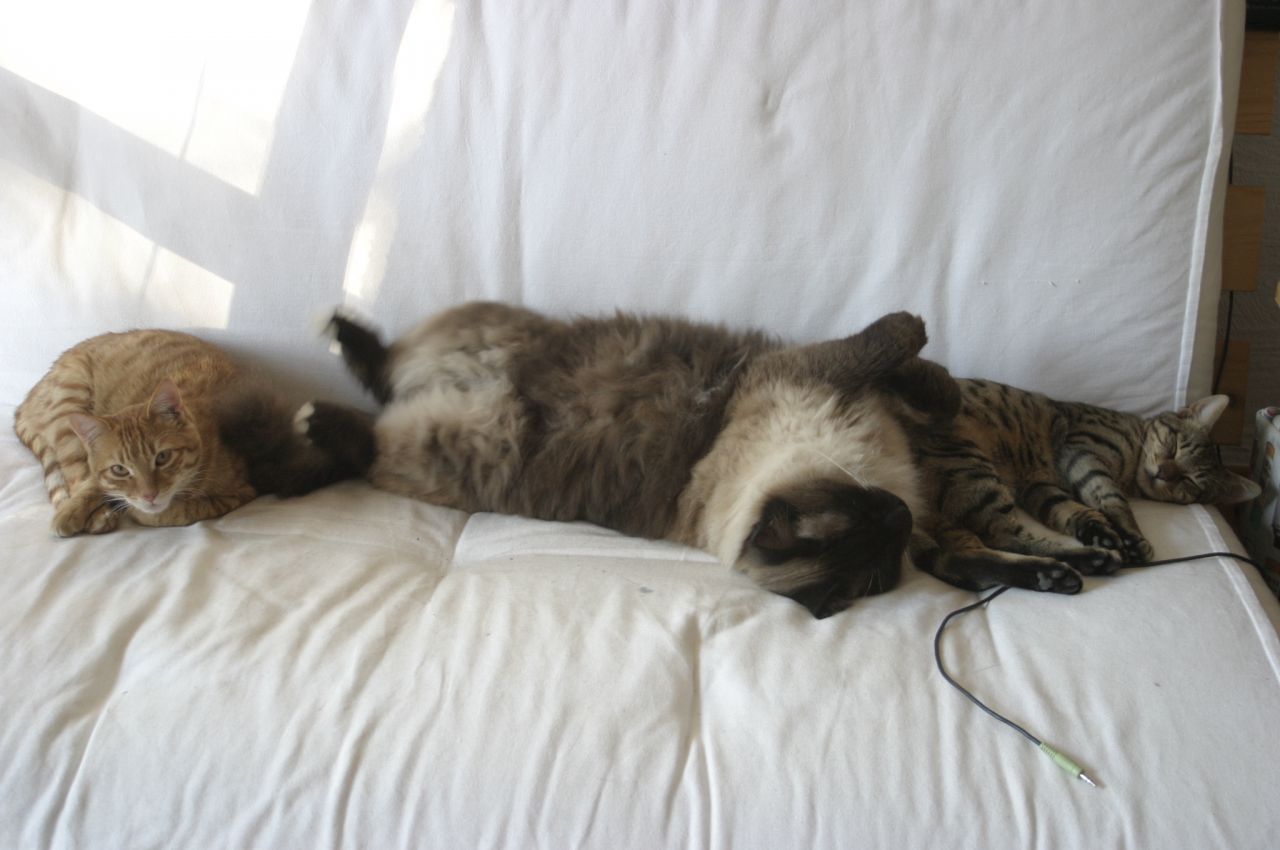 | Dire merci | Mes deux derniers lascars : Samy (le rouquin) et Cooky, presque 7 mois ![]() Cooky en plein baillement ![]() Et mes deux petits avec un de mes deux gros, Loustic (7,6 kilos de tendresse !), 8 ans ![]() Et mon vieux Enzo, 12 ans ![]() |