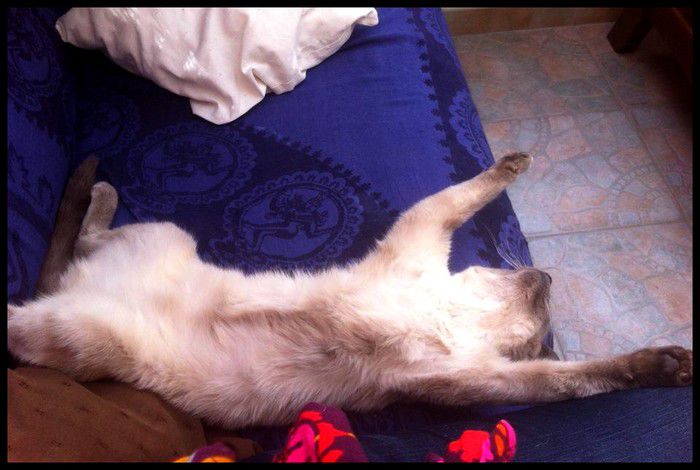 | Dire merci | Sucre33 , manole et pticoq ils sont trop mignons vos loulous Pour ma part Chatoune a complètement récupéré, elle pète la forme, ça fait du bien de la voir comme ça! (Je regarde sa cicatrice quotidiennement (heureusement qu'elle aime se mettre sur le dos^^), ça à l'air propre et pas trop gonflé, pourvu que ça dure!)Et en plus de ça, elle n'a pas changé de comportement suite à sa stérilisation, elle est toujours aussi caline voir collante Elle a fait la rencontre de ma soeur et de son copain (c'est lui qui me l'a ramené) hier soir, on l'a pas vu beaucoup au début puis ils sont allés dans la cuisine accroupis et hop la miss sort de sa cachette pour plein de caresses! Et après elle ne nous a plus décoller de la soirée D'ailleurs, son copain m'a appris qu'elle avait été seule 15 jours dans un appartement vide avec une fenêtre entre-ouverte qui donnait sur le balcon... La voisine du dessus balançait une poignée de croquette de temps en temps mais Chatoune devait pas en récupérer des masses, c'est pour ça que je l'ai récupéré toute fine et affamée... (et la voisine du dessus n'a même pas téléphoné à l'agence pour dire qu'un chat était seul dans un appartement...pffff...) 15 jours je trouve ça énorme! Pauv' louloute!Dur dur la convalescence pour Chatoune |