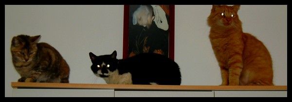 | Dire merci | Ooh mais il est trop bien ce post (je découvre des choses en ce moment) Bon bah alors voici mes chats : De gauche a droite : - Baboune (F) , Feo (M) , Chicoré (M) ![]() >Baboune : Née en 2005 ; c'est ma chérie d'amour ![]() ![]() >Feo : Né ??? ; On la receuillis il y a un mois et demi environ, il été très mal en point, et il a le sida ![]() (Il a une collerette car, il a un vilaine plaie sur un cuisse..) ![]() >Chicoré : Né en 2007 ; C'est ma grosse peluche ( et oui grosse, il est presque obèse, donc il est au régime en se moment) ![]() ![]() Voilou |