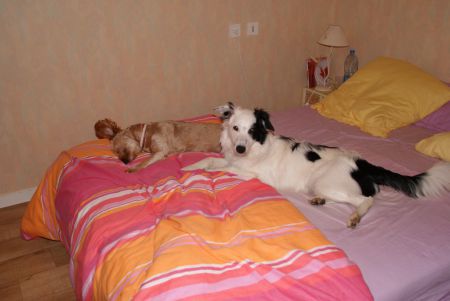 | Dire merci | Pouh : je te rassures à la base le lit est aussi à moi...mais au bout de 6ans de vie commune avec mes "canines"...bennn mais moi elles montent quand j'ai le dos tourné ou quand je le dis...elles s'invitent pas dedans quand j'y suis...vu qu'à la base elles ont pas le droit Et encore je dis "on"...mais y a que athéna qui se le permet...valeska attend la permission même quand on est pas là |