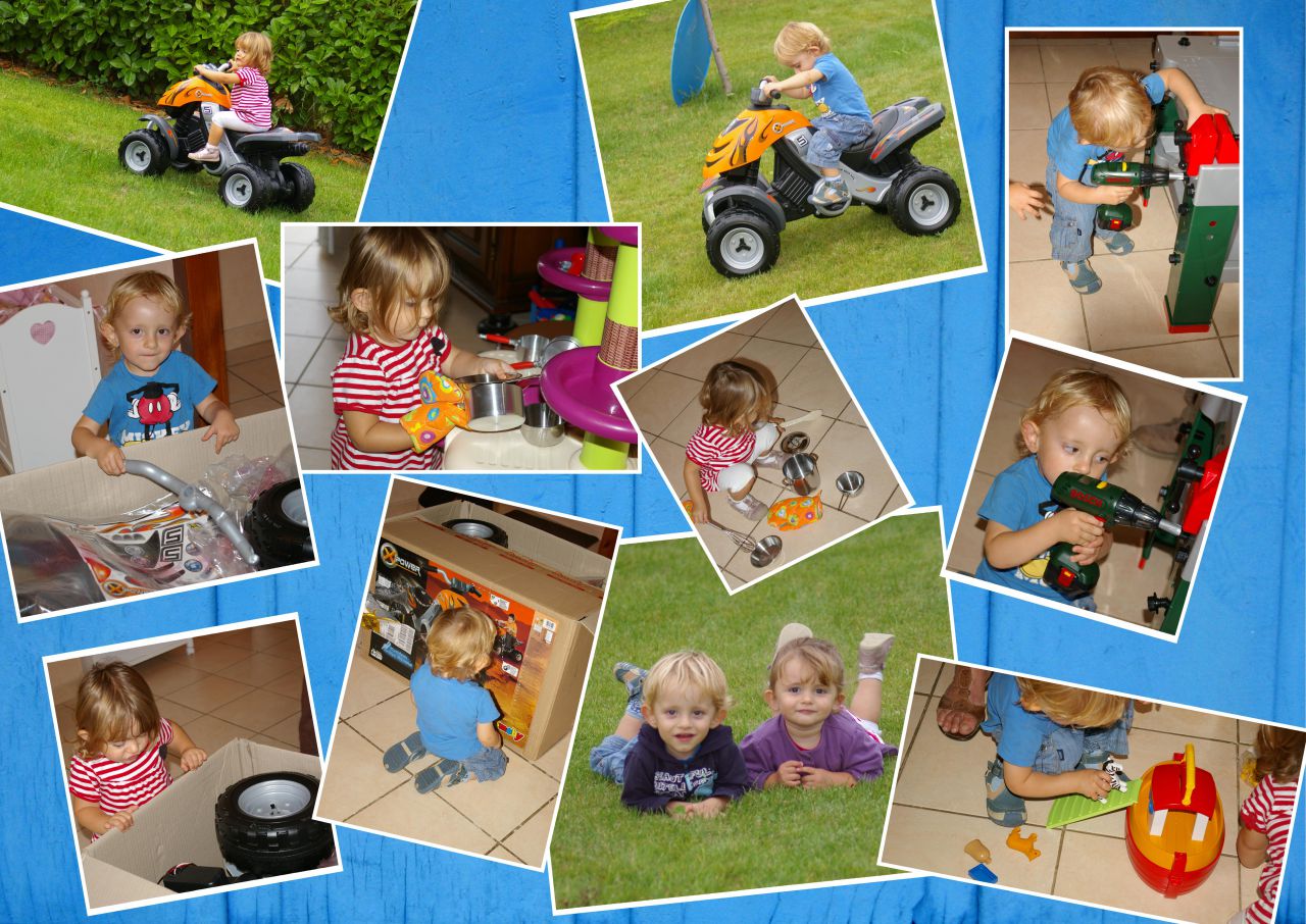 | Dire merci | Alexa, Coline est aussi dans une phase "j'ai peur du bain" depuis 1 mois environ... idem pour la piscine, avant elle adorait maintenant elle a peur, le seul truc qu'elle aime c'est quand elle a de l'eau juste aux chevilles pas plus ! Du coup pour la laver on doit être deux, un qui la tient dans la baignoire et l'autre qui lave tandis qu'elle hurle comme une folle... ![]() Hier j'ai testé en la laissant debout dans la baignoire avec très peu d'eau, et j'utilise uniquement un petit gobelet pour mouiller et rincer, surtout pas la douche ! et ça a été... est ce que la méthode lui convient ? est ce que sa phase "peur de l'eau" est en train de passer ? j'en sais rien mais j'apprécie ! Cyanne, j'espère que ton loulou ne sera pas malade, si ton père s'est bien lavé les mains ça devrait aller Lee, elles sont super les photos ! C'est rigolo le quad, moi je suis sure que Coline aurait peur ! sinon a voir les jouets sur les photos, ils ont l'air de manquer tes grumeaux... l'atelier mecano pour Anatole, et la cuisinière pour Léonore ! |