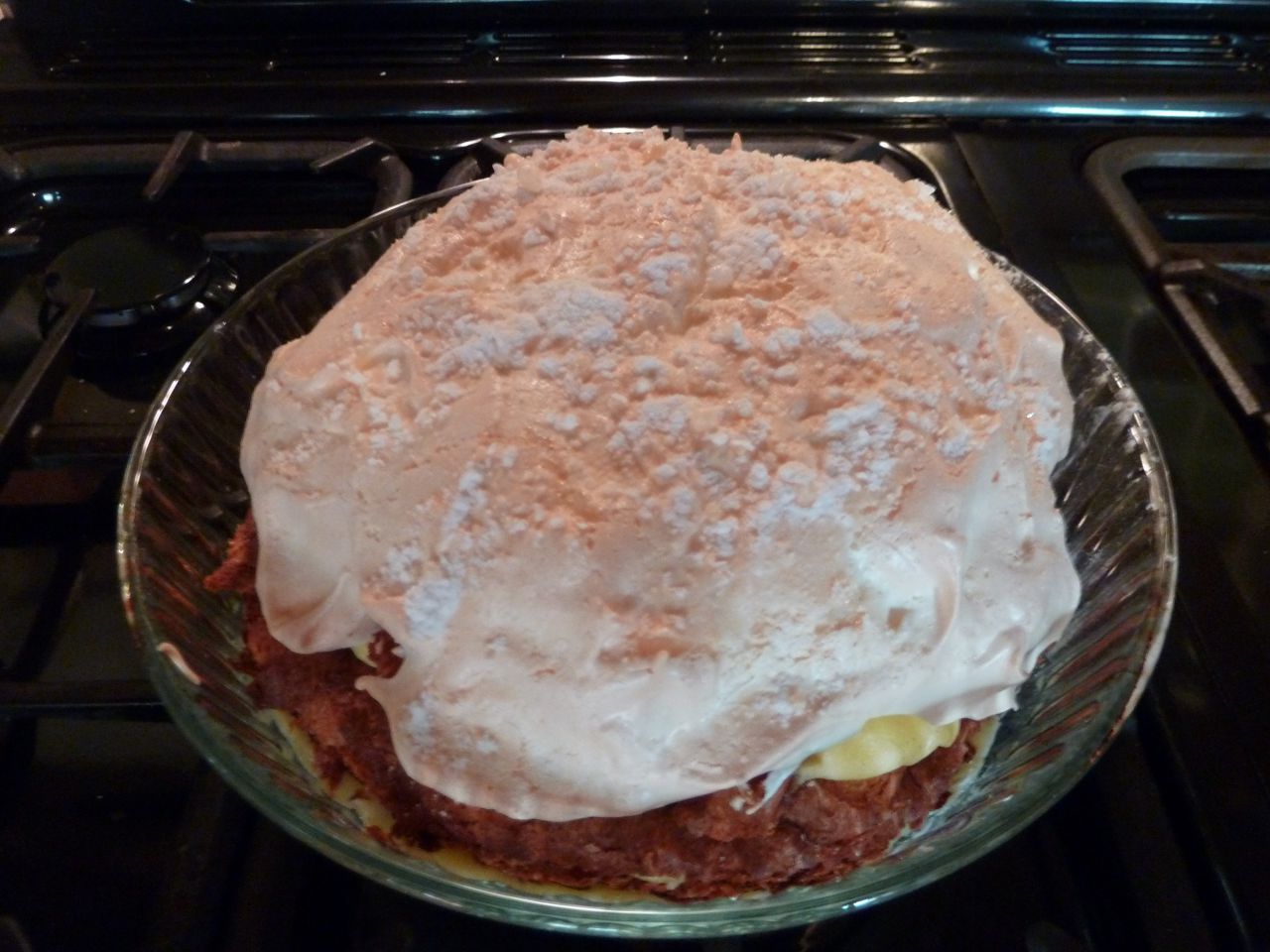 Déconnecté | la zuppa inglese, c'est une base de genoise imbibée de sirop au rhum et au marasquin, fourrée de crème pâtissière et de fruits confits et surmontée d'une merigue italienne ( moelleuse ) 3 heures de préparation, bouffée en 10 minutes .... moralement c'est dur |